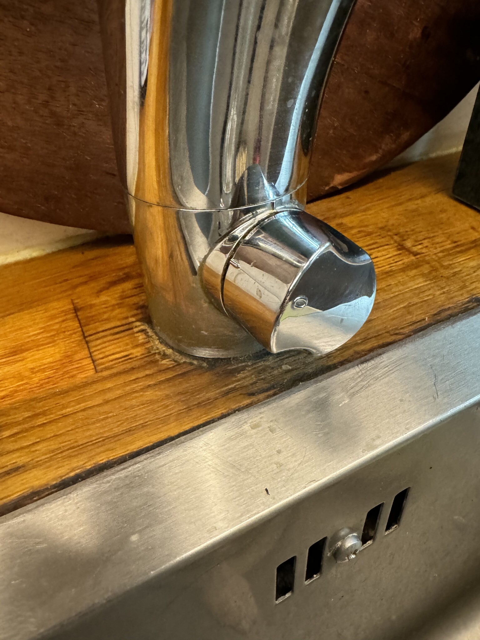 Enl mitt förmenande bör blandaren sitta monterad på en rostfri diskbänksplåt som har uppvik mot vägg och en kant som hindrar fukt att rinna ut på skåp/golv och minst en helst två svetsade hoar.