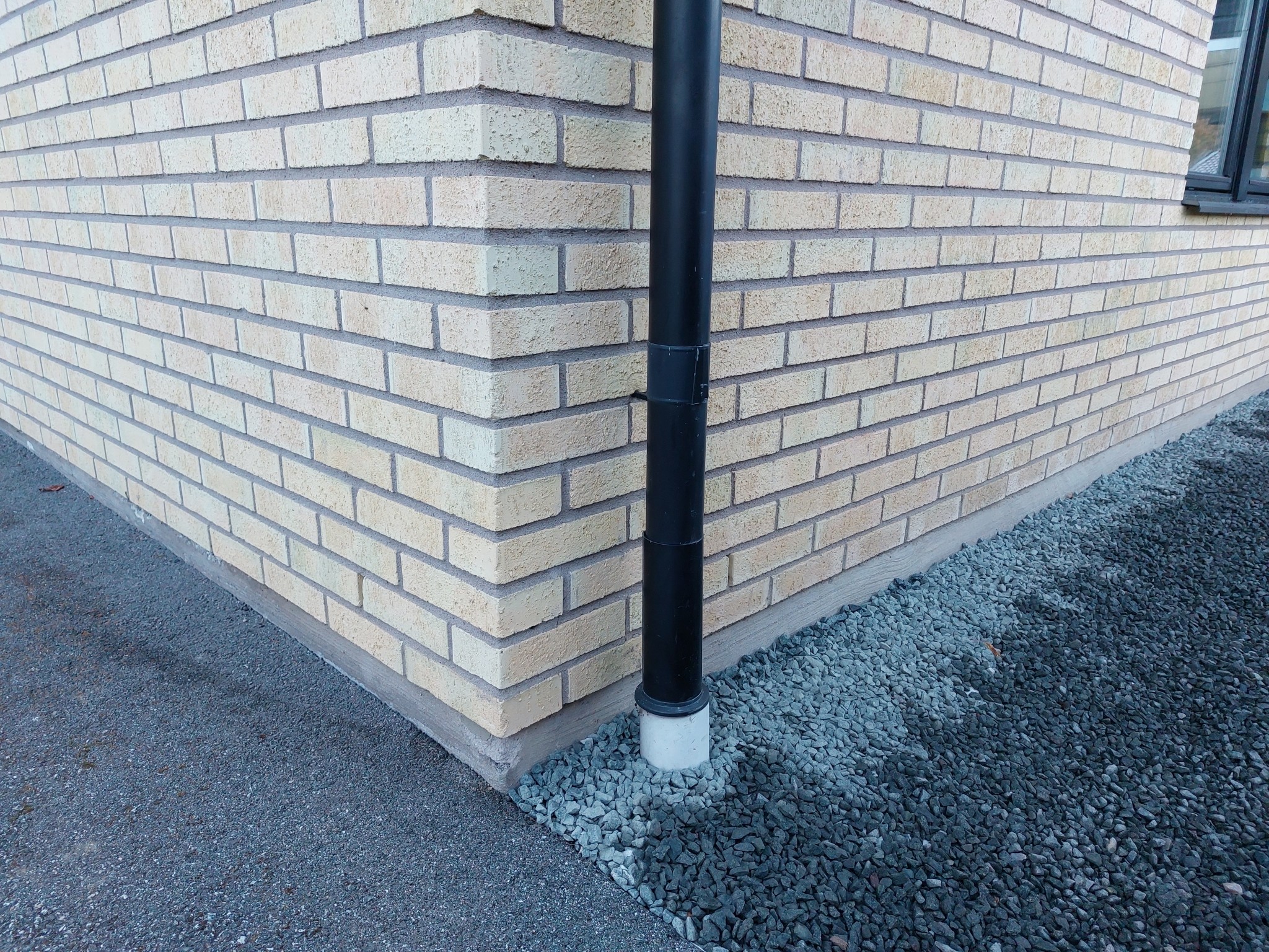 På utsidan av denna vägg sitter ett stuprör som går ner i marken. Jag har öppnat röret och tittat ned så gott det går. Det ser ut att leda en bra bit ner i marken och det finns inga tecken på stopp på den del jag kan se. I övrigt har det suttit buskar längs med delar av denna vägg, dessa har vi tagit bort och lagt markduk+grus istället. Huset ligger på en förhöjning och marken sluttar bort från huset på aktuell plats. Det har släppt lite i sockeln på hörnet, men inget extremt.