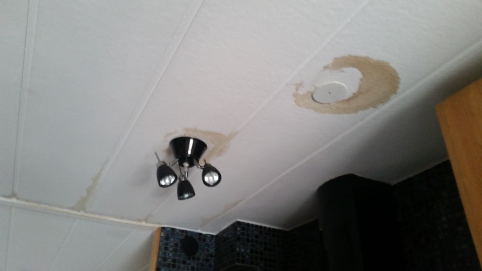 Eftersom jag var hemma imorse så upptäckte jag plötsligt flera bruna fläckar i taket precis under där de arbetade. Fläckarna känns till ytan inte fuktiga, men det ser ut som solklara fuktskador.