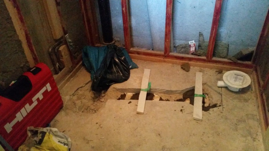 Jag har anlitat en entreprenör för att renovera badrummet på överplan. De har nu rivit all inredning och har bilat i betongvalvet för att flytta/byta ut golvbrunnen.