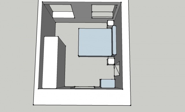 Jag har laborerat med tanken att sätta garderobsväggen mot den nedre väggen, som du föreslår, men utrymmet mellan den andra dörren (som är bredvid nattduksbordet) och väggen (där det står en liten byrå) är bara 45 cm djupt. Det får alltså inte plats någon normal garderob och det måste vi ha, annars blir det för lite utrymme.