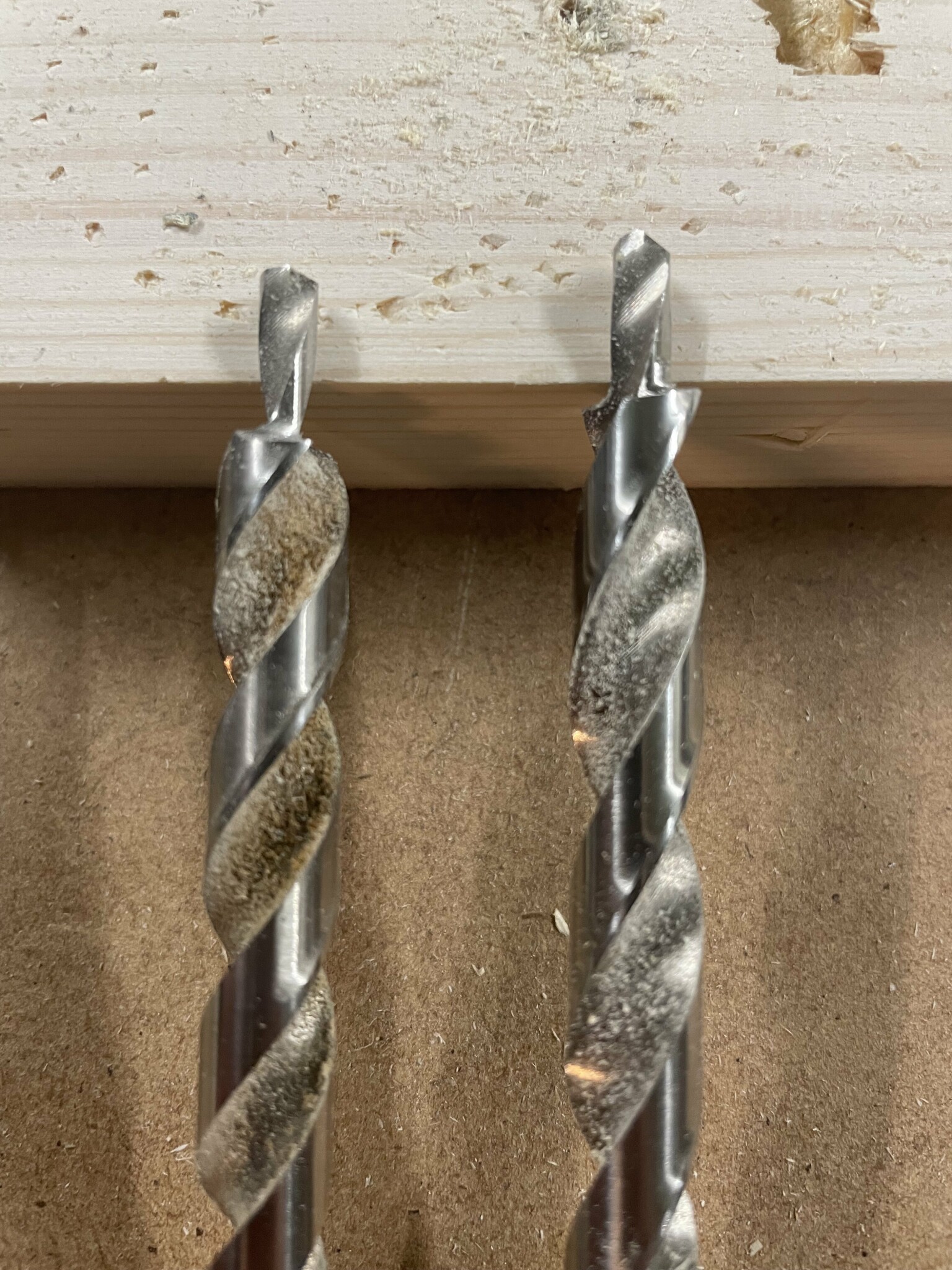 Jag kollade lite mer noga på Kreg-borret och kan konstatera att det måste ha blivit något fel i produktionen. Om man tittar på borret så når skäret inte längst ned. Borrspetsen är ok, men skäret som kommer i den tjockare delen av borret kommer helt enkelt inte först när man för borret mot ämnet. Se bild. Det vänstra borret är Kreg och det högra är Milescraft. Det syns tydligt att skäret på det högra borret är närmare spetsen än resterande del av "borrkroppen". På Kreg-borret till vänster är det en ås till vänster om skäret som är närmare spetsen än skäret. Inte så konstigt att det inte kan göra fina skär i ämnet då...