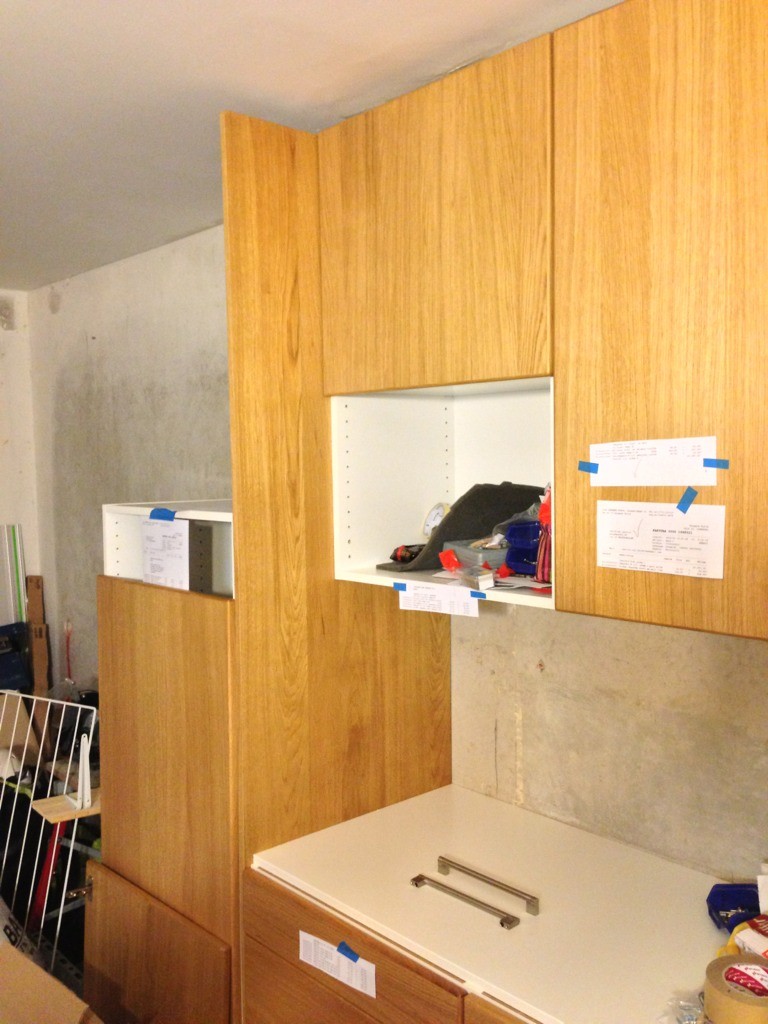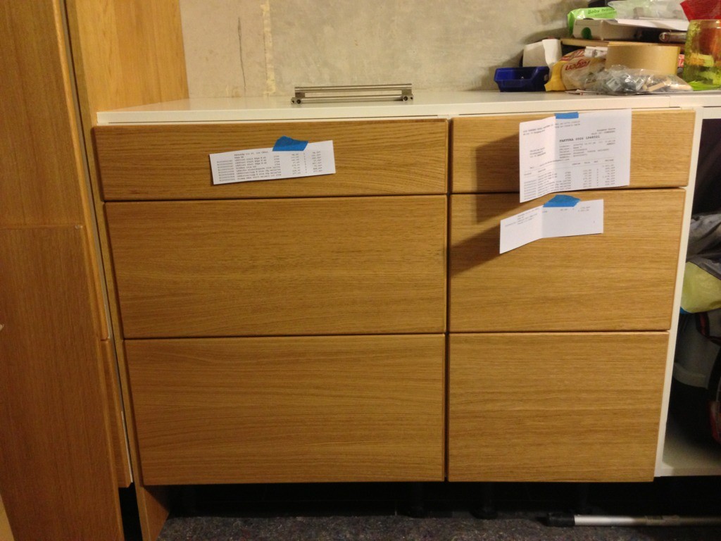 Alla lådor är monterade, nästan alla luckor satta. Handtagen är kvar att montera, lär bli att bygga en mall så att alla hamnar precis rätt.