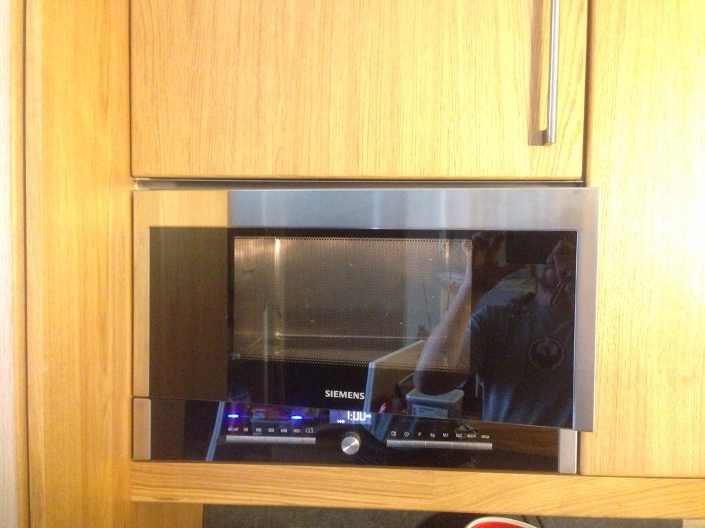 Inbyggnadsmikro! Lyser blått, den öppnas med en knapp. Amäh behövs något mer? Ingen roterande platta på insidan, för mig är det en omöjlig mikro(!)