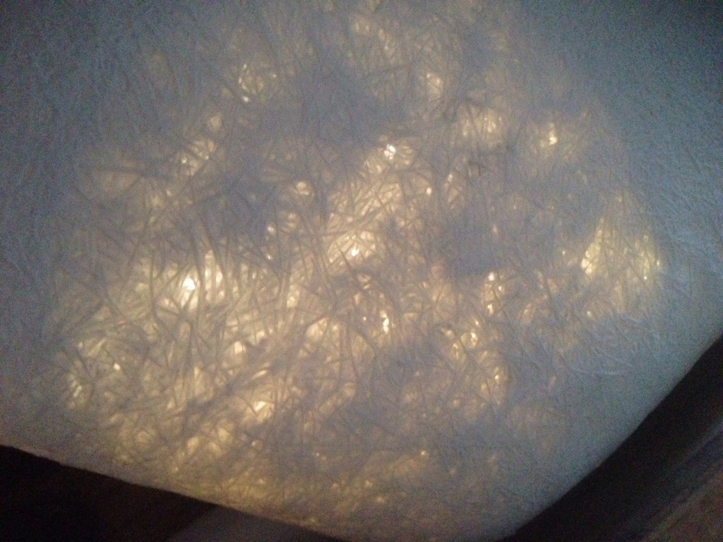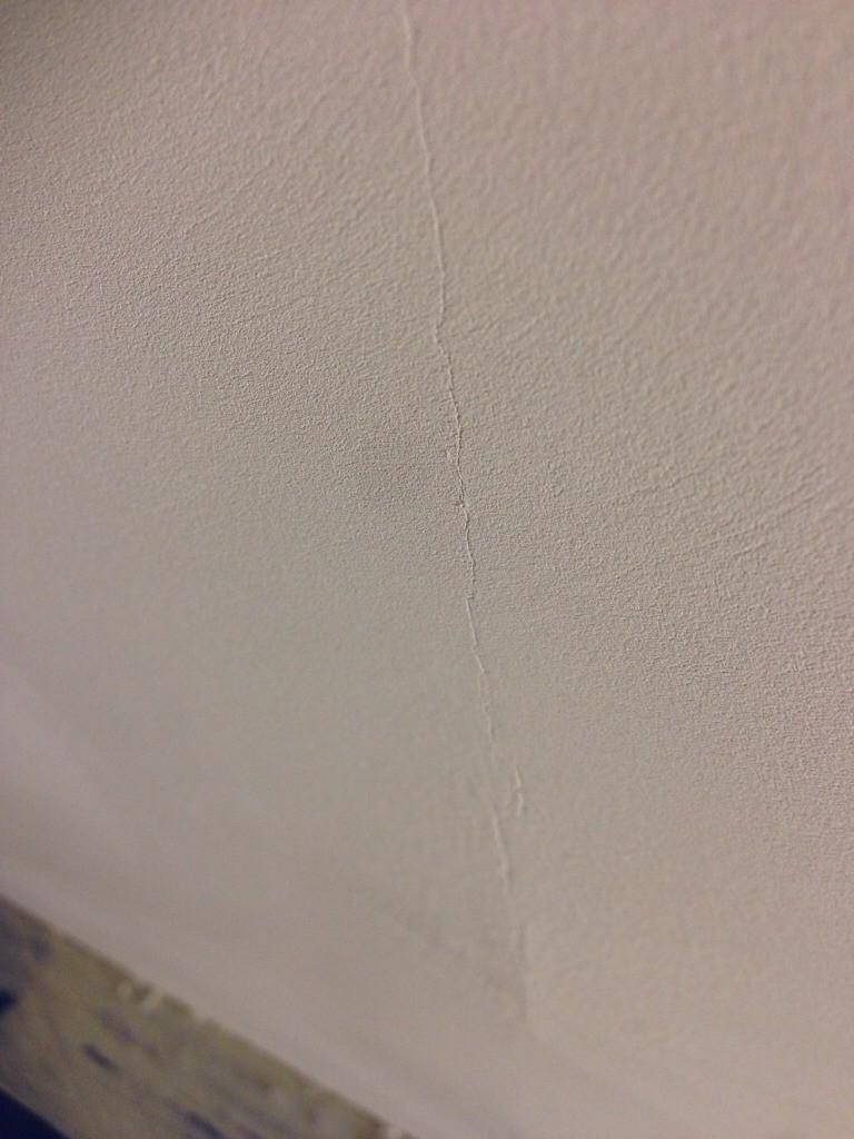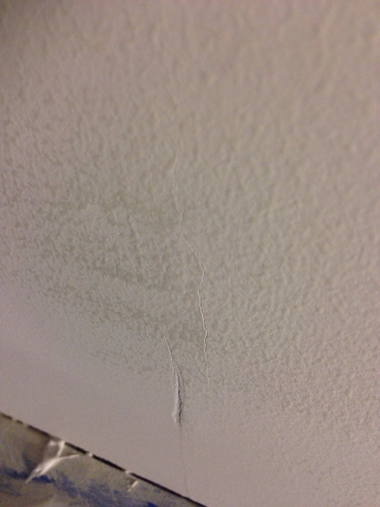 Trots bara 8 kvm tak, fäst med 12 spix och 3 punkter PL400 (misstänker tanten ovanför har sitt avlopp där jag ville borra) och remsa så sprack det. Försökte krafsa ur sprickan och spackla igen. Fungerade inte.