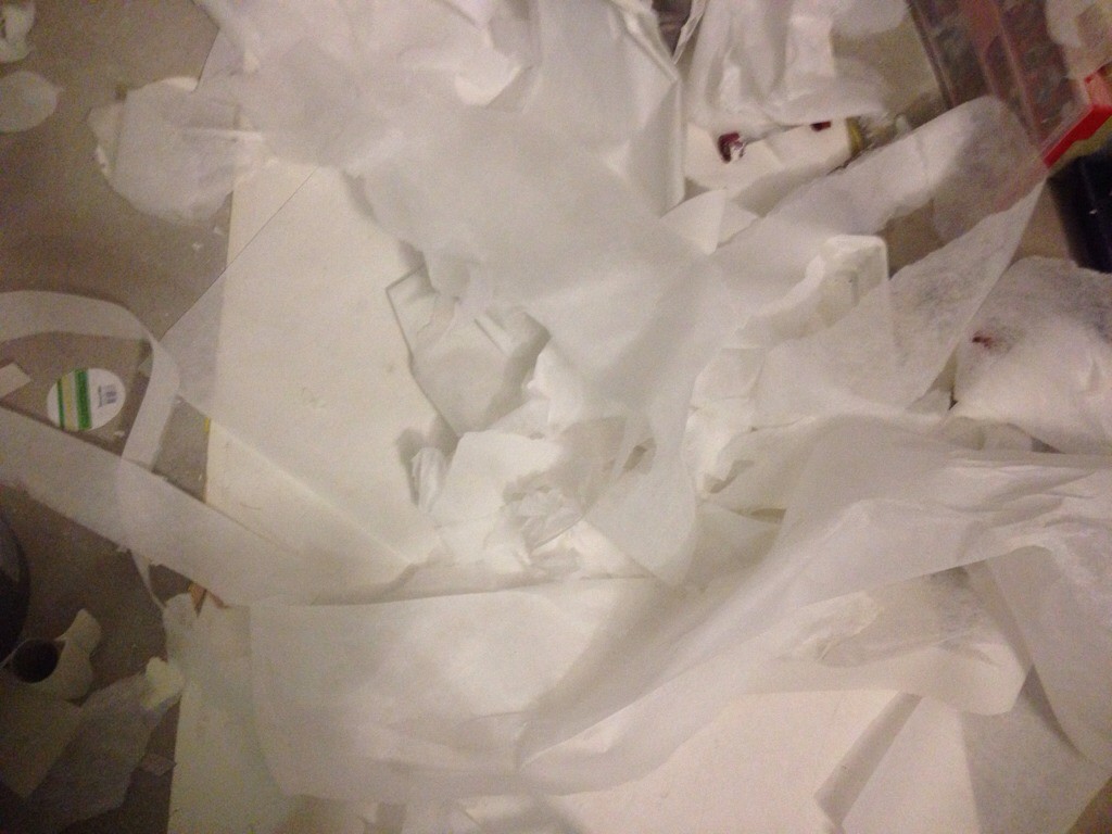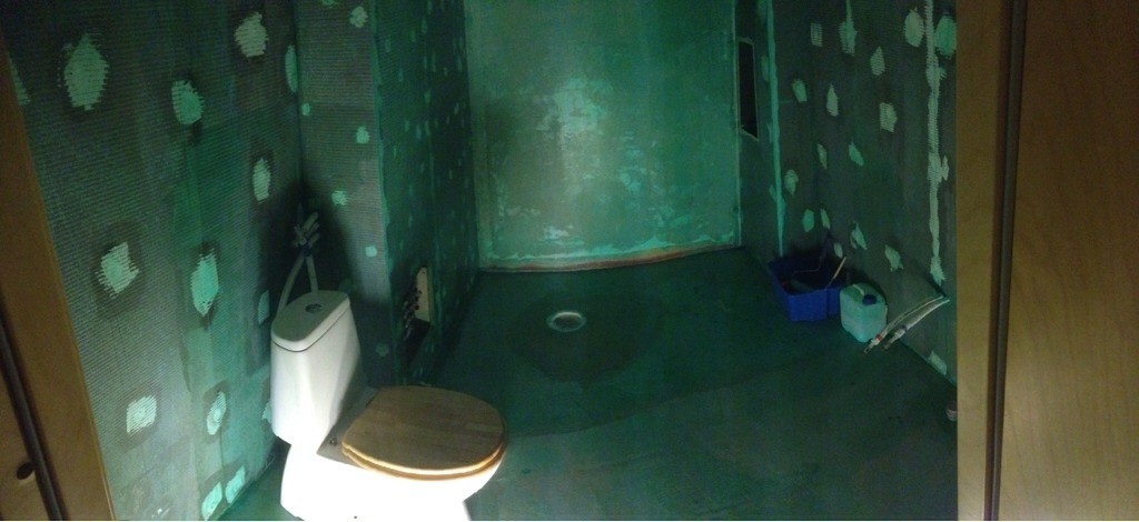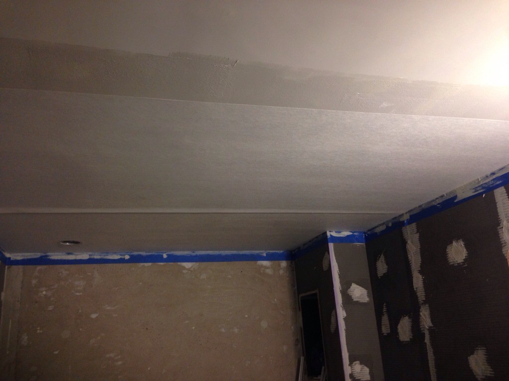 Skar i överlappningen och inser att jag är en idiot. Kanske trött också. Måste ju ta bort överflödiga bitar när det är blött, såklart. Dessutom fanns det ytor där det inte fäst trots att jag tyckte jag hade en massa våtrumslim. Obviously not.