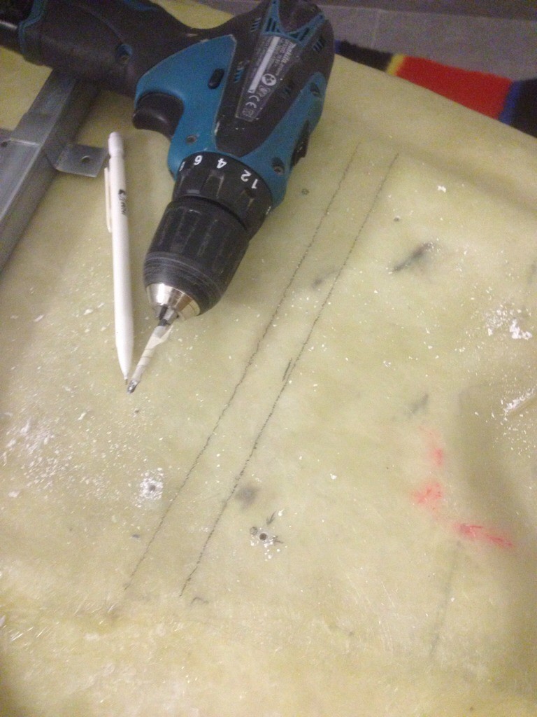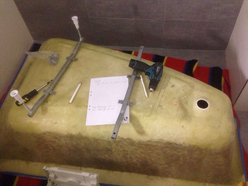 Dags för badkaret att få fötter. Läskigt att borra i badkaret.