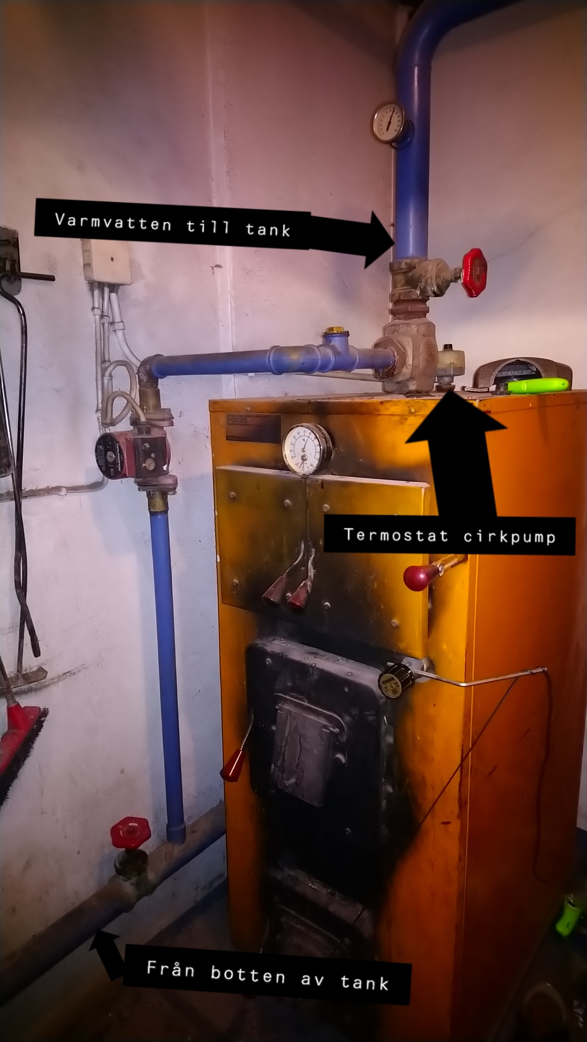 - I nuläget självcirkulerar vattnet mellan panna och tank eftersom rören är så grova. Cirkulationspumpen på bilden uppfattar jag vara en slags laddomat? Förra ägarna har inte använt den, men utifrån vad jag har lyckats läsa mig till är det en väldigt bra pryl avseende förvärmning av vatten till pannan för att undvika korrosion och att vattnet skiktar sig bättre i tanken. Jag märker ingen skillnad när jag använder den - antingen pga att den är kass (den skramlar en del så impellern kanske är loss?). Om jag skulle byta denna, vad väljer jag då? Har sett lite mer avancerade versioner av laddomat. Tas ex. hänsyn till att rören är så pass grova? Hur funkar det i praktiken med en fungerande laddomat? I nuläget skiktar sig vattnet sakta nedåt, så att ex. mittenvisaren inte visar någon förändring alls fram tills att den ganska snabbt går upp i full temp, alltså att vattnet är tydligt skiktat. Det är således lite svårt att lyckas elda lagom. Rörmokaren beskrev det som att tanken kommer att värmas upp jämnt om denna cirkulationspump är igång.