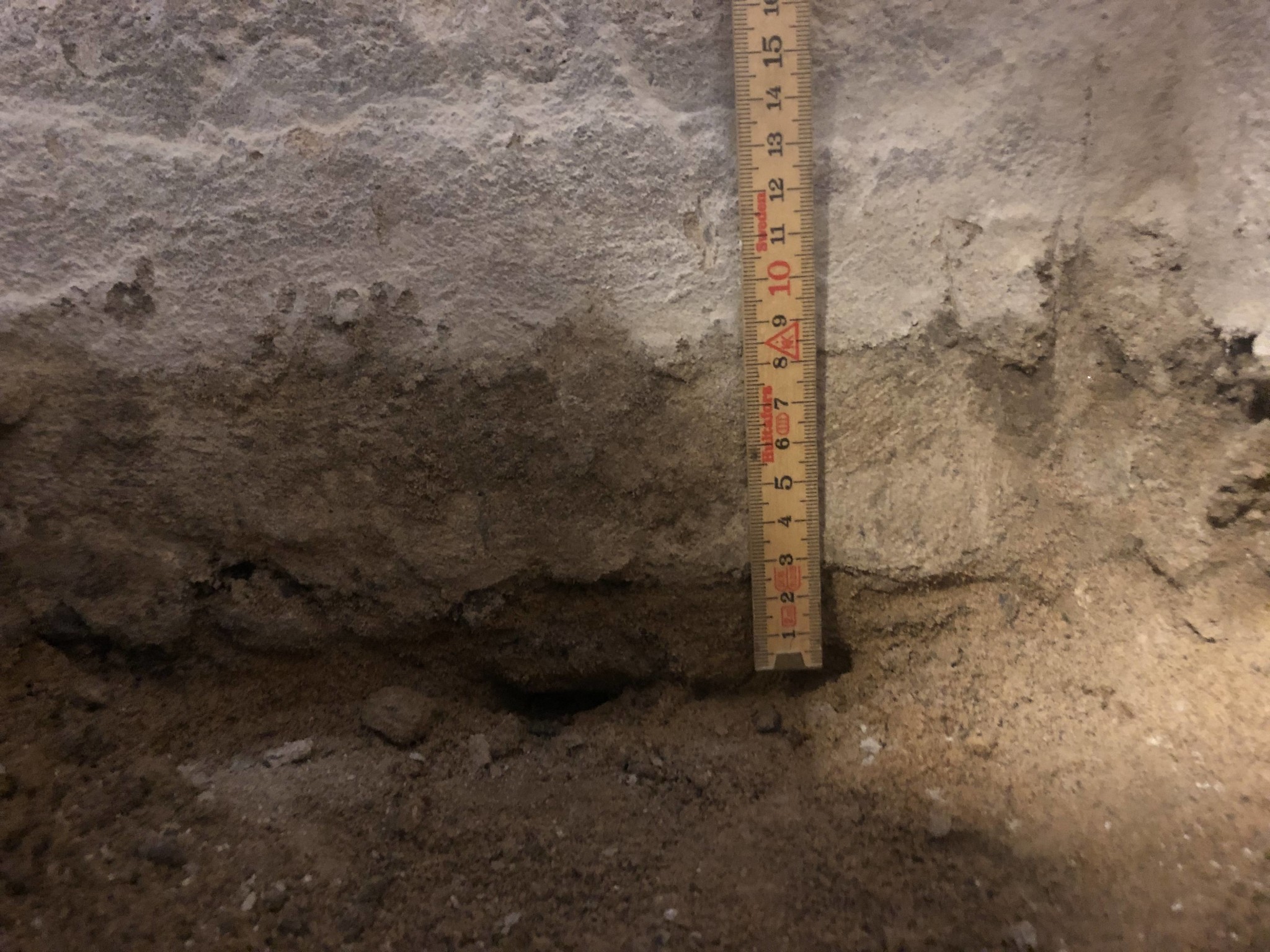 ...men har nu stött på bekymmer. Jag har precis knackat ner takputs och lös puts på väggarna. Tog sen upp två stycken provhål för kontrollera hur långt ner sulan låg. Golvet är ca 5cm tjockt med massa sten i. Till min förvåning finns ingen sula och ca 10 cm under befintlig golvnivå tar väggen slut...