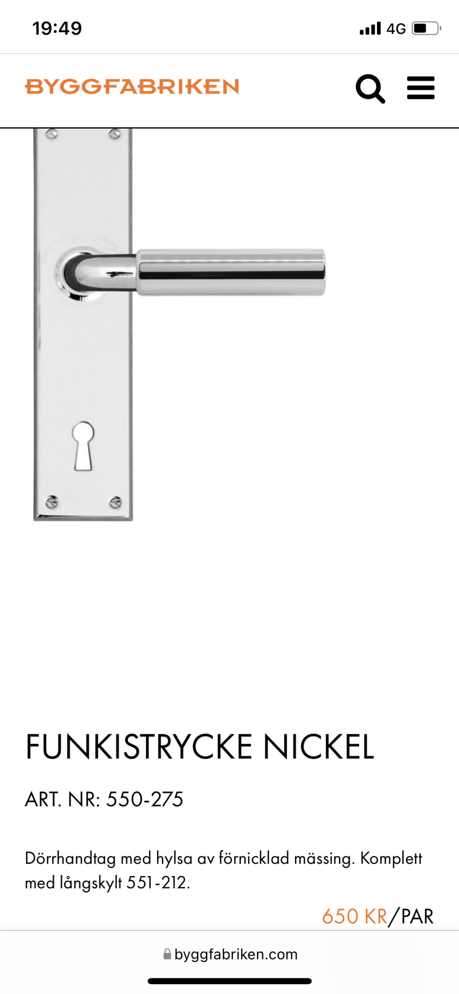 Hej, Säljer ett funkistrycke i nickel från byggfabriken, se länk nedan. Helt nytt, aldrig monterat. Perfekt skick. Nypris 650 kr, pris 300 kr. Finns i Linköping men kan skickas mot förskottsbetalning. Mvh, Viktor https://www.byggfabriken.com/beslag...kel/info/product/550-275-funkistrycke-nickel/