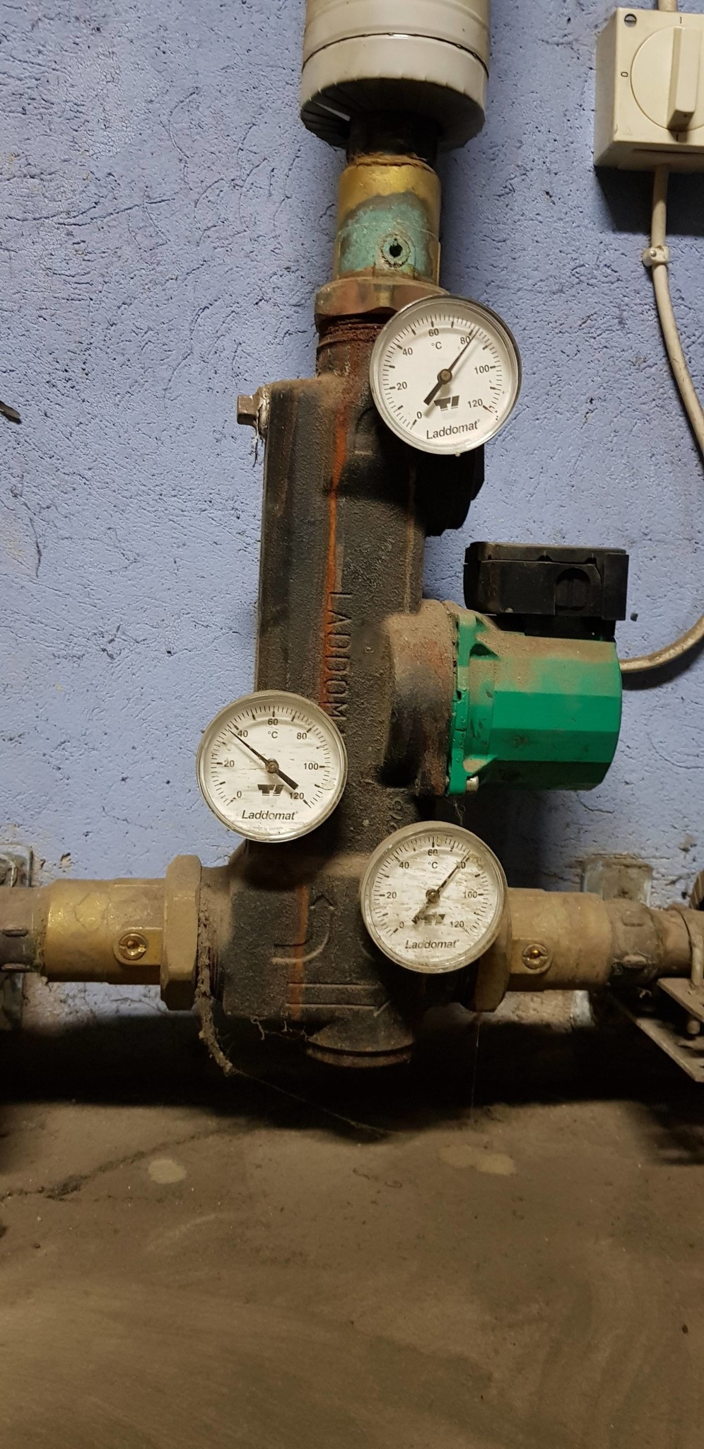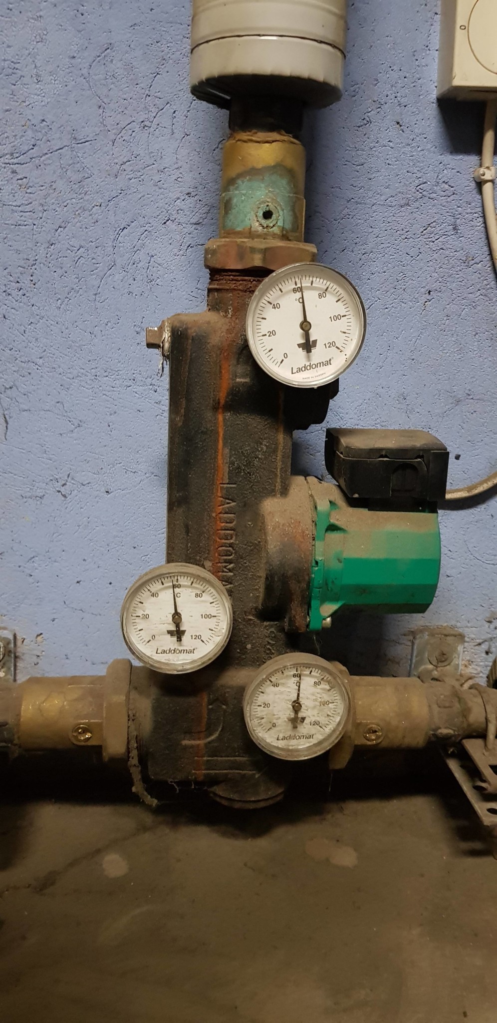 Tanken sitter till vänster , men det är samma temp på pannans vatten uppifrån som in till pannan , den nedre mätaren ska ha en temp på ca 55-65 C , uppifrån kommande 80 C ska blandas ut med den från vänster . är nog termostaten som sitter i laddomaten som inte är som den ska , pumpen går nog .,, prova med att knacka med en hammare strax under den övre mätaren . Hjälper inte det så får du nog byta termotsstaten i den , den verkar inte öppna som den ska