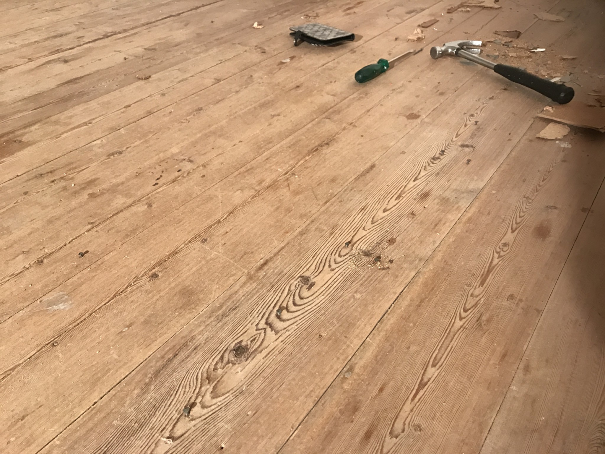 Håller på renovera ett sovrum och klädkammare (fd. kök fram till 50-talet/huset byggt 1919). Har bestämt mig för att fixa till golvet för att se hur det kan bli. Känns det inte bra så är det iaf lagat och vi kan lägga ett laminat ovanpå.