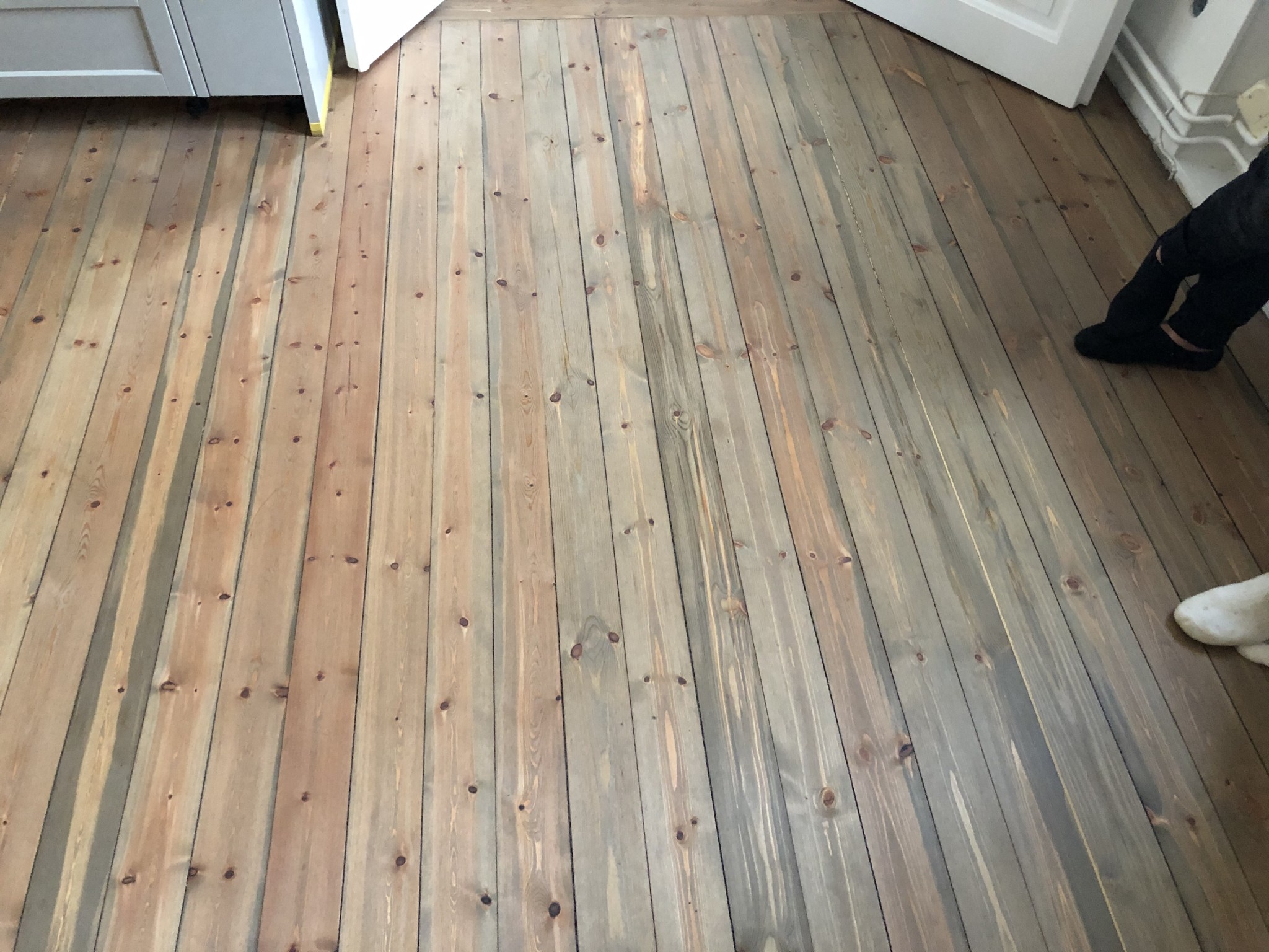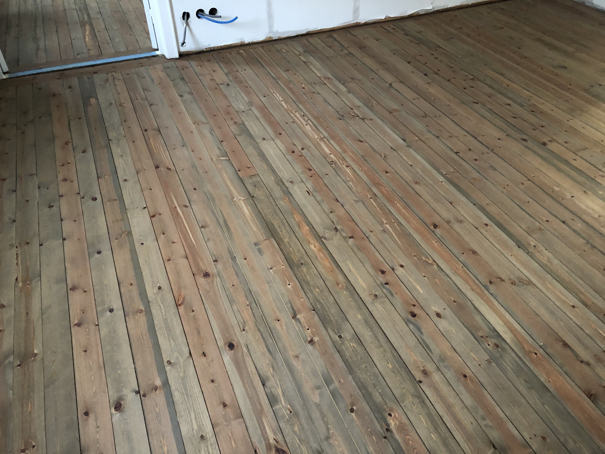 Det var nog avsett att vara undergolv när huset byggdes, men i ett av rummen var det tidigare klarlacket med bra resultat. Borde inte golvläggaren ha kunskap om vilken behandling som kan funka på ett gammalt undergolv?Fotografen skrev: