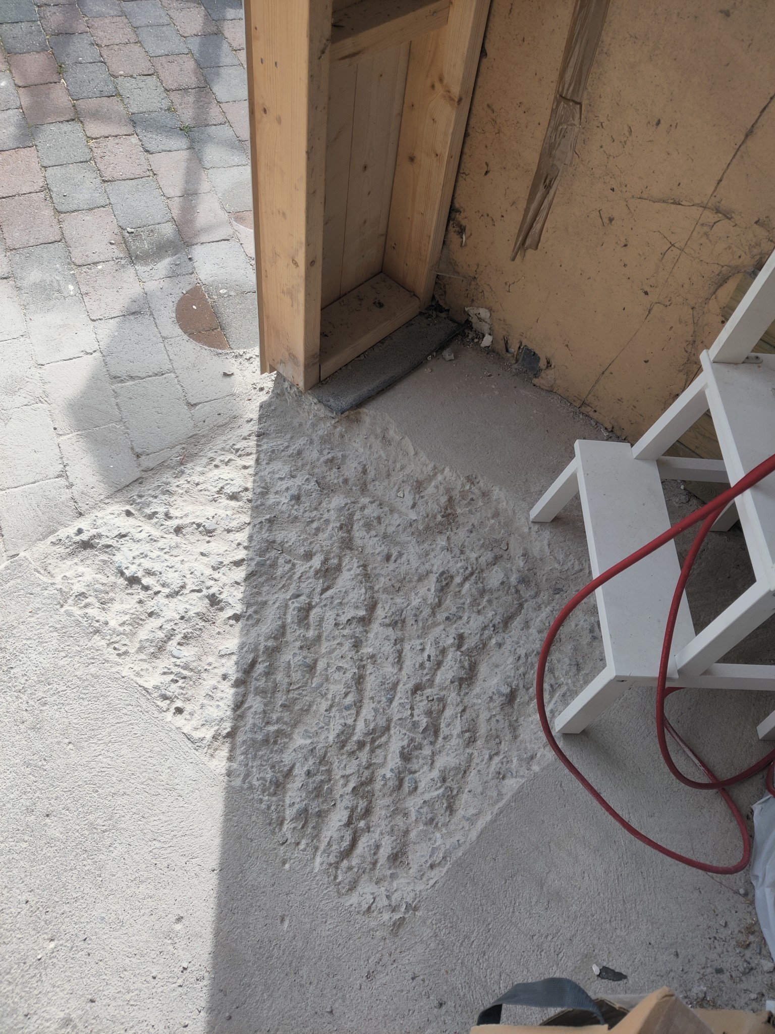Ska sätta in ny bredare garageport och fick precis en klack bortbilad ur garagegolvet (där det tidigare stod en soptunna på). Någon som har tips på hur jag kan jämna ut denna yta? Det är sluttning utåt eftersom det är ett garage.