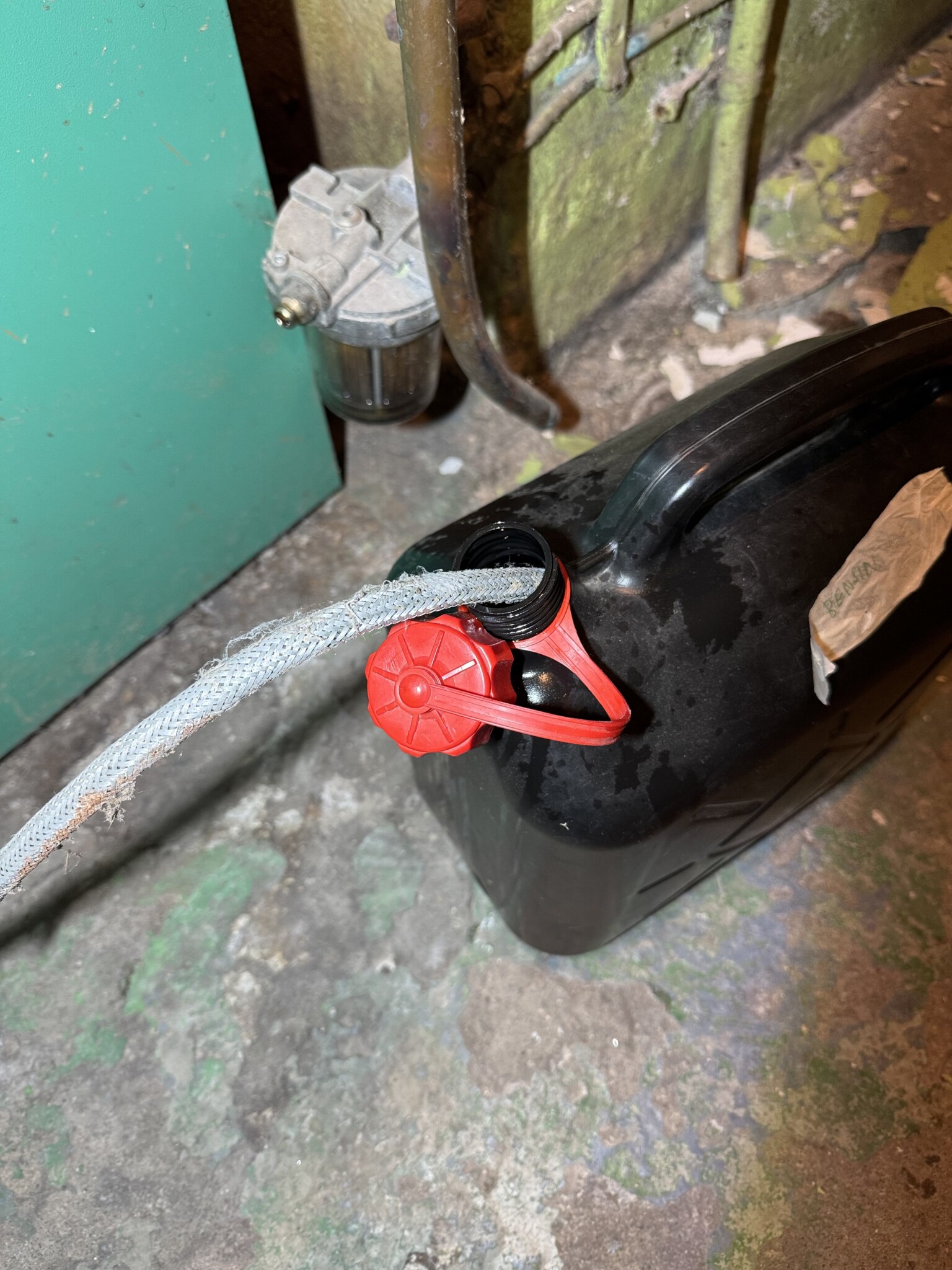 Om det känns jobbigt att transportera och fylla oljan räcker det förmodligen att lyfta ena änden av oljetanken nån tum från golvet med en stor kofot eller ett spett, stoppa sen under en regelstump eller brädbit mellan tank och golv så den kvarvarande villaolja i botten kan sugas upp på vanl vis.