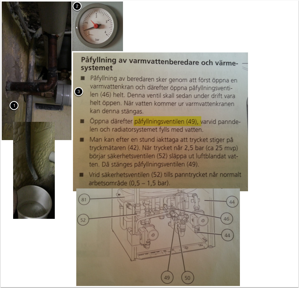 När vi försökte fylla på vatten tolkade vi instruktionen som att vi inte behövde göra alla steg, så vi började från punkt 2 i instruktionen; "Öppna påfyllningsventilen (49)", se bild 3.