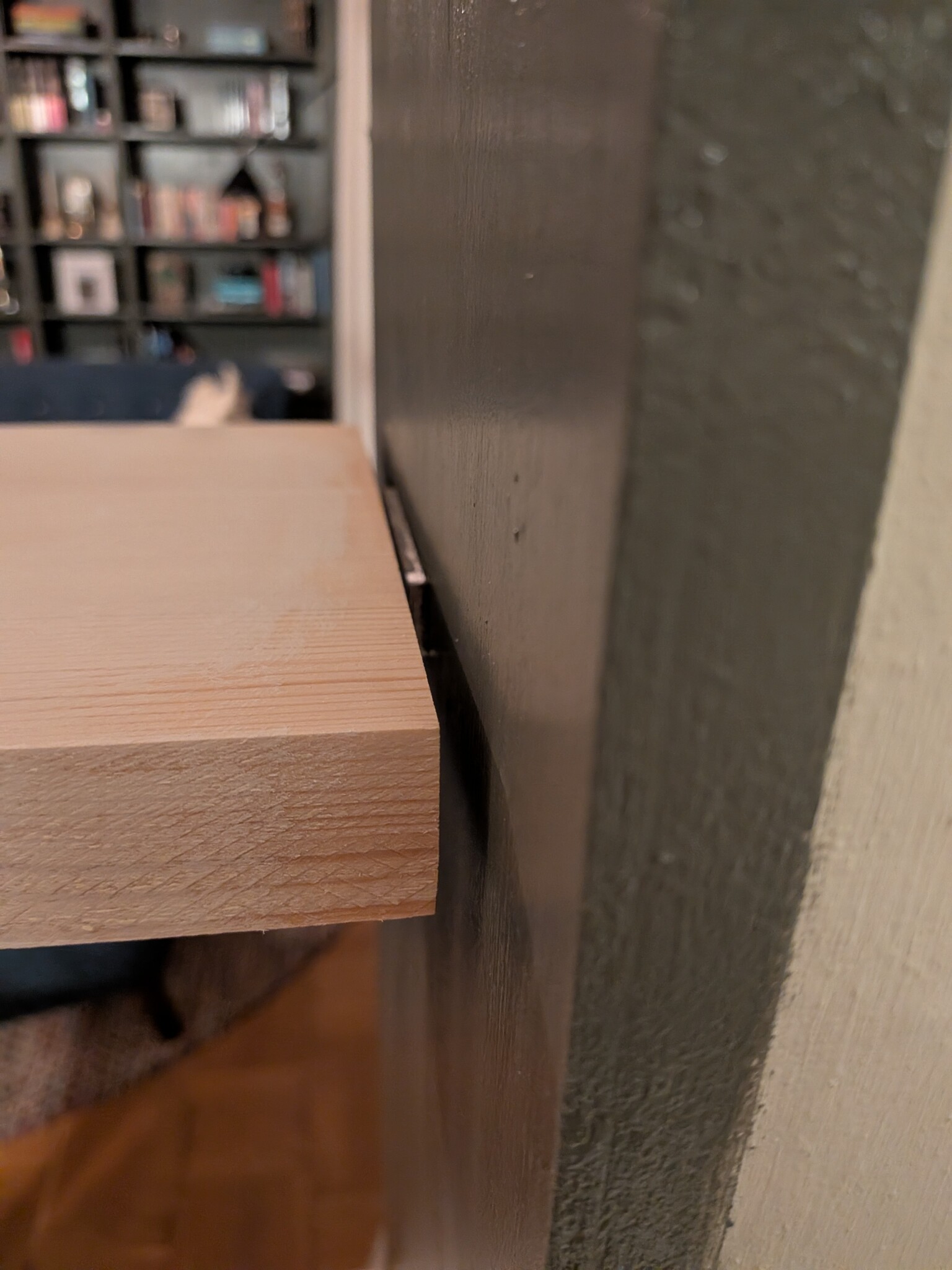Håller på med en rumsavdelare med dolda hyllkonsoler. Var ett aber att försöka holka ur på sidorna av brädorna för att helt dölja fästena då de sprack i kanterna så slutade med att de fick åka upp ändå. Det resulterade i drygt 5mm springor mellan hyllplanen och väggen som helst av allt skulle behöva täckas och målas över.