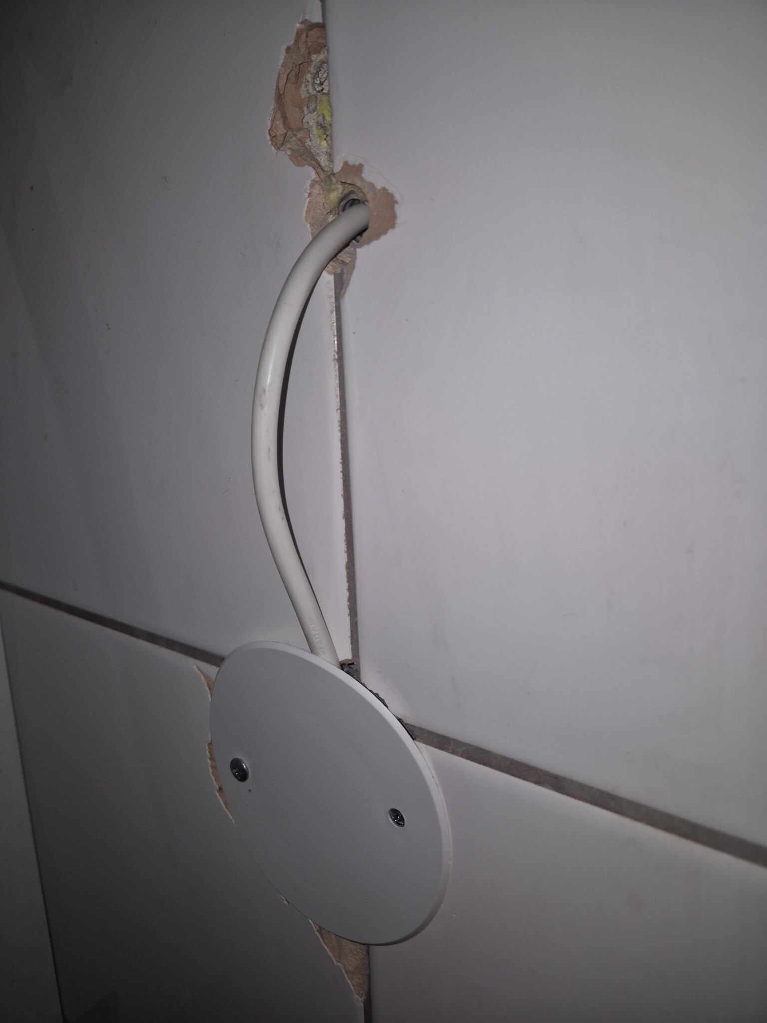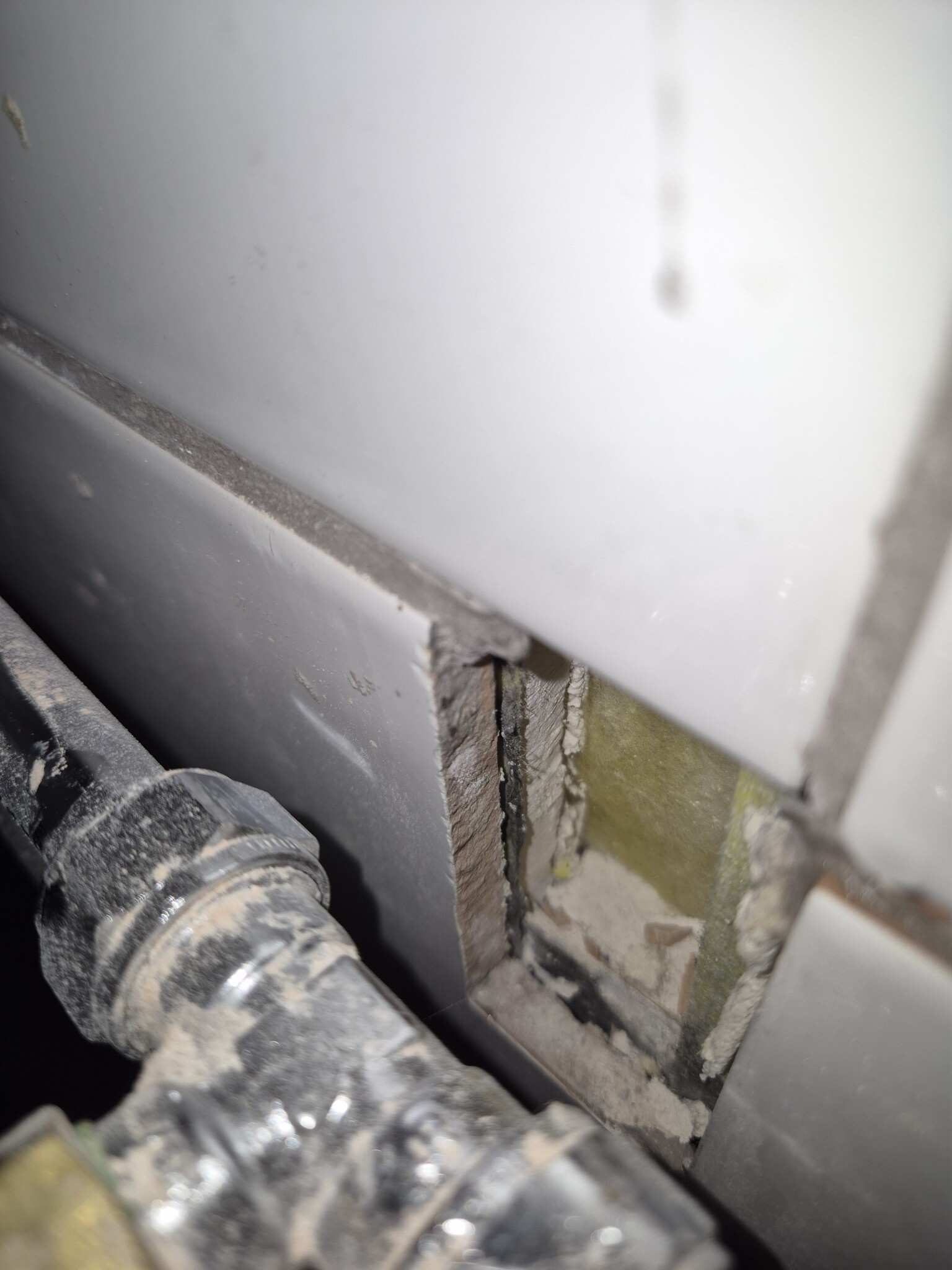 Det som återstår nu är ett hål i kaklet i tvättstugan där rören tidigare gick. Hålet är ca 5 x 5 cm och sitter ungefär 20 cm ovanför golvet, bakom tvättmaskinen. Genom hålet ser man in till isoleringen bakom badrummets tätskikt.