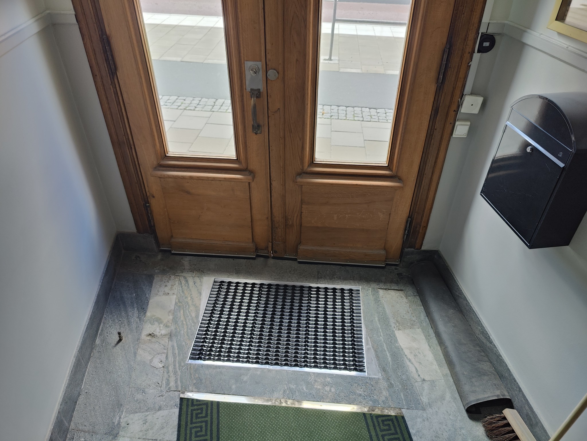 Hade ju varit snyggast med en rombformad matta (som jag gissar att den gamla var), men det måste säkert specialbeställas och blir dyrare för er BRF, som troligen har till uppgift att fixa billigaste lösningarna så ni medlemmar ska slippa avgiftshöjningar.
