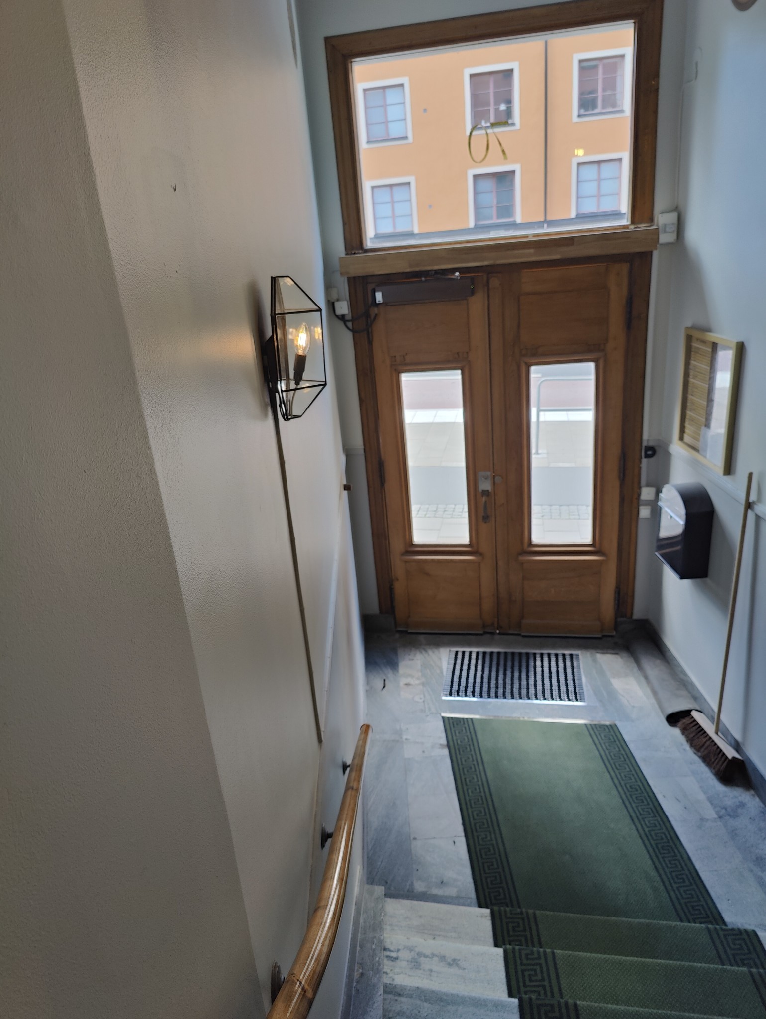 För att man ville följa stenarnas linjer? Jag antar att dörrpartiet inte är vinkelrätt mot entrén i övrigt. Jag tycker att det ser ut att ha varit genomtänkt förut, men säkert krävt dyrare dörrmattor – om det inte är så att vanliga går att vinkla nog många procent.AndersMalmgren skrev: