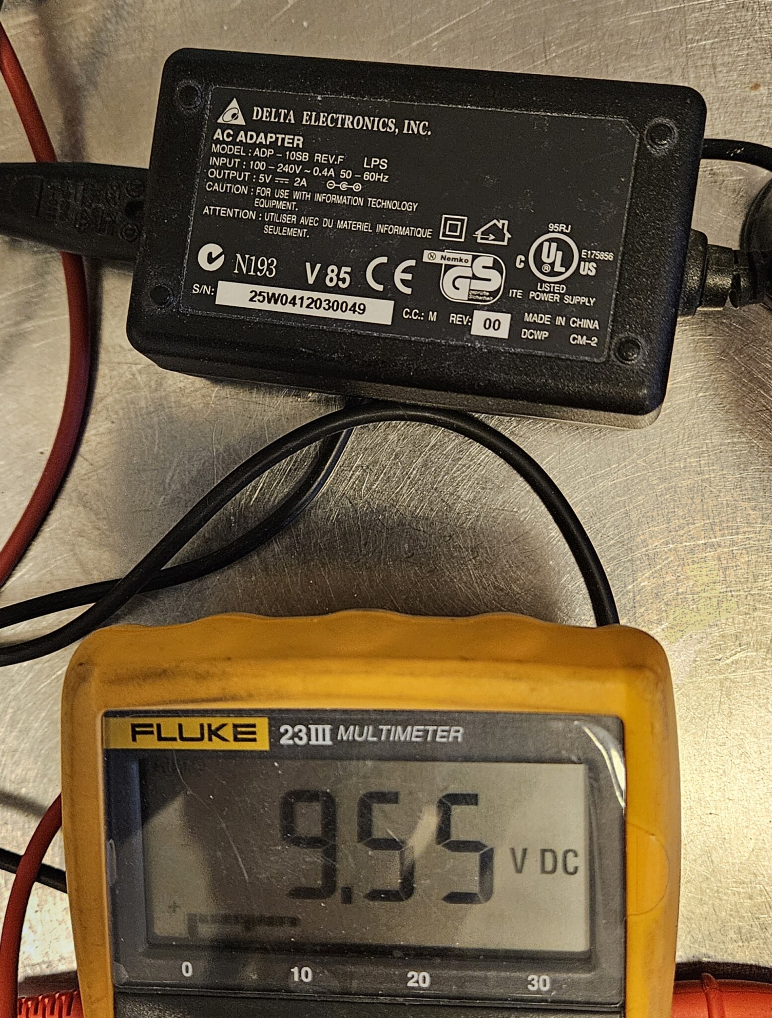 Jag mäter nätadaptern som lämnar >9V, specad till 5V, så den har antagligen grillat servern. Ganska ovanlig feltyp tror jag.