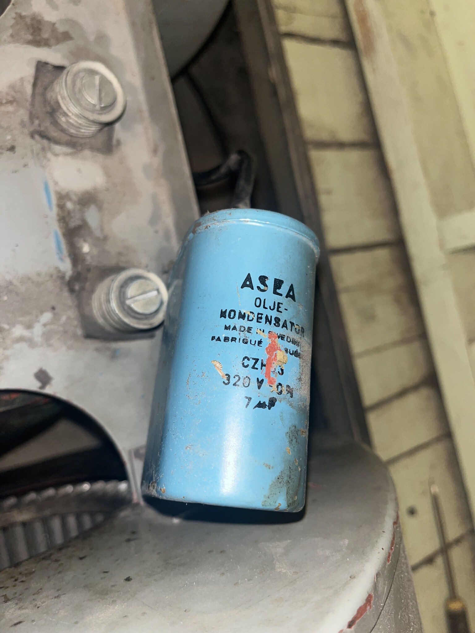 En start-/motorkondensator på helst 450V 7μF, bör även fungera med lägre spänning men lägst 250V men ju högre spänning ju bättre.