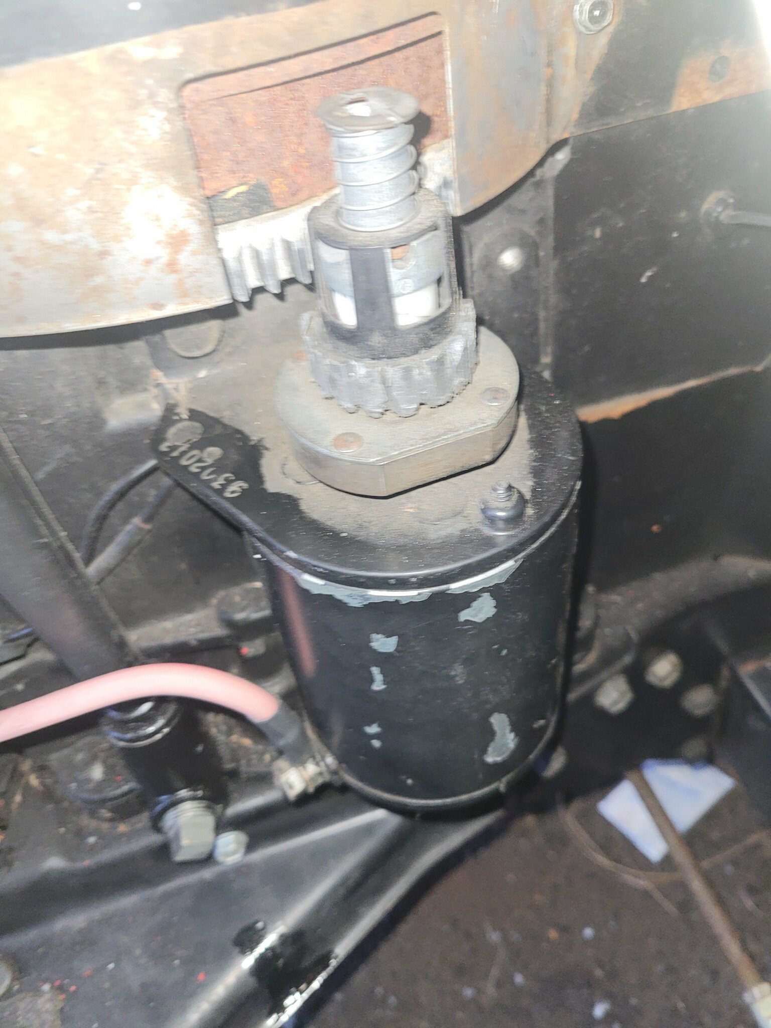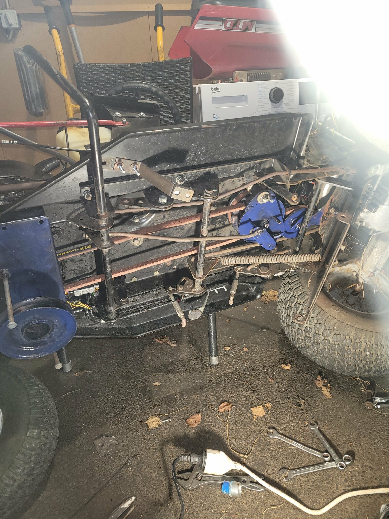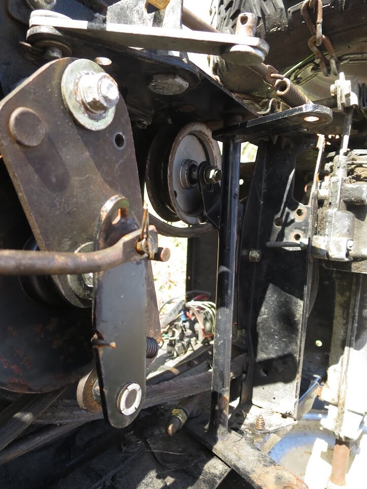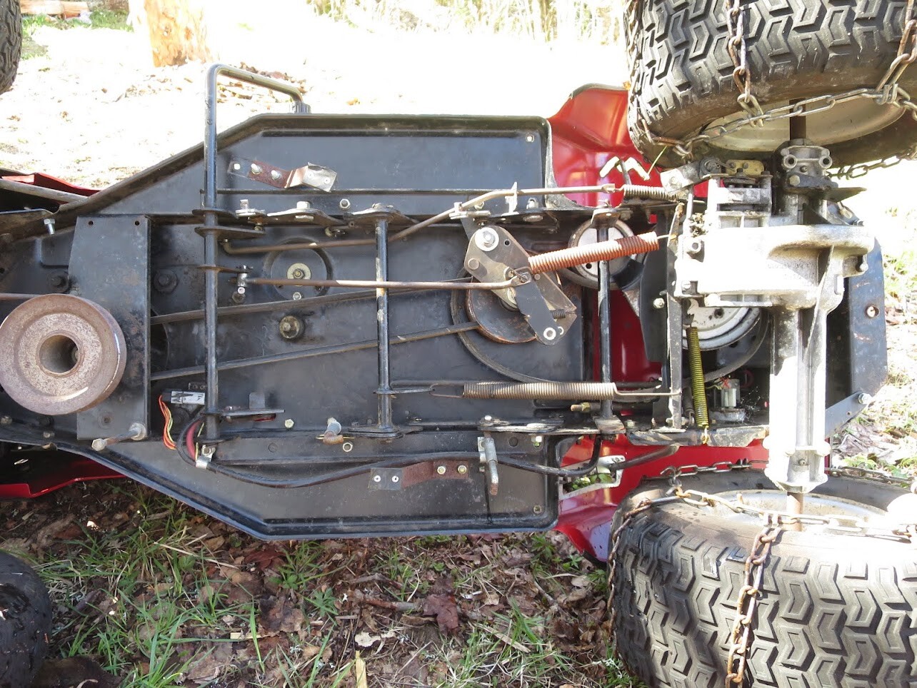 Jag hittade faktiskt några gamla bilder, vet inte om det hjälper. Dock har jag inte kvar min längre Jag fick problem med att drivremmen hoppade av konstant. Efter lite undersökning upptäckte jag en stor spricka i själva chassit eller vad man kallar det på en trädgårdstraktor. Den var liksom knäckt på mitten så det blev slack på remmen. Men så körde jag ett par vintrar med plogblad så den lär ha skakat sönder.