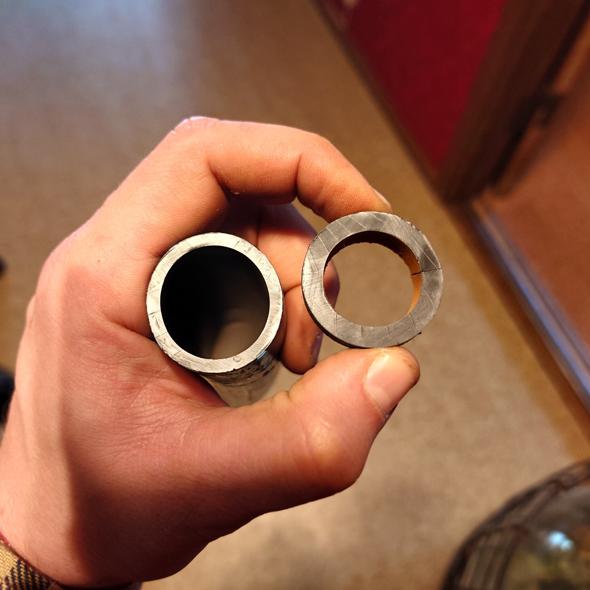 Slangen är mer tjockväggig än jag är van: (till vänster en ny vanlig DN80 32mm x 3mm, till höger den befintliga vars vägg är nästan 5mm tjock)