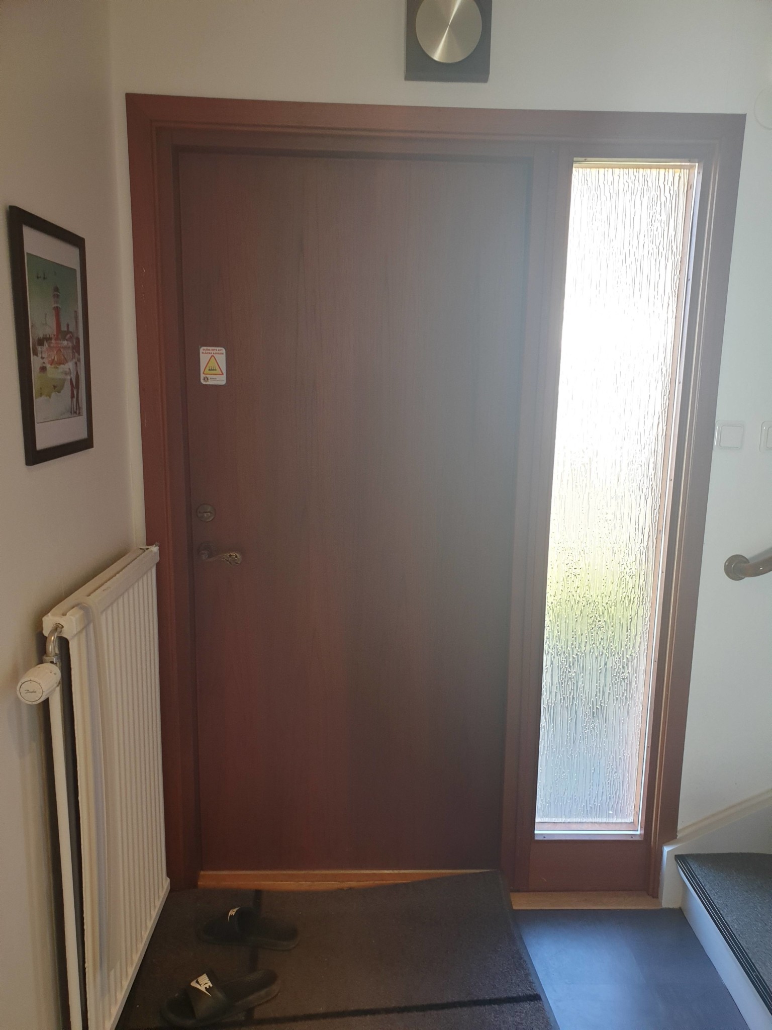Roligt att se någon som har exakt likadan dörr som oss. Dörren är av Teak. Slipade själv ner den helt och oljade den sen med Jotun Benvar UVR med rekommendation från vår lokala färgaffär. I sista bilden har oljan inte torkat. Det går ju bra att slipa ner dörren, men det var ett mäck att slipa ner karmen