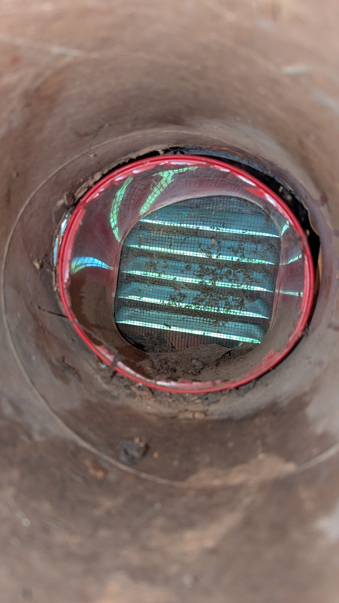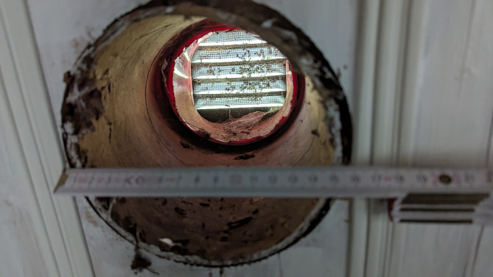 Jag noterade då att röret som sitter där är någon form av papprör samt att det är intryckt ett plast rör längst in (se bild). Så nu undrar jag om jag kan lägga in ett nytt plast rör i det gamla (ta bort det andra plaströret) som går hela distansen och som jag ansluter till en enkel badrumsfläkt med variabel hastighet som jag sedan kör på låga hastighet, eller kommer det skapa kondens problem.