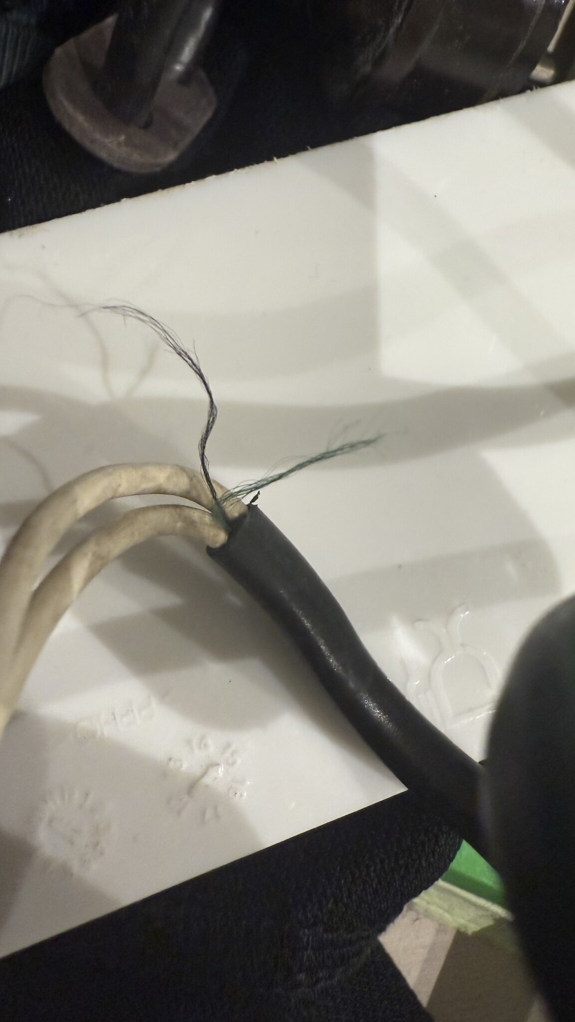 Har köpt en lampa på auktion med tre likadana lampor kopplade till en stickpropp. Jag behövde byta stickproppen och när jag klippte bort den så visade det sig att alla kablarna inuti sladdarna har samma färg (vit). Däremot sticker det ut en grön och en svart (alt blå) tråd bredvid de två kablarna i de tre sladdarna. Det är alltså tre sladdar och två kablar i varje sladd). Ska koppla ihop dem igen via en kopplingslist el kopplingsklämma till en och samma stickpropp (nyköpt) men jag känner mig osäker på om det ens går med dessa kablar? Svårt att beskriva hur jag menar men men kanske enklare när man ser bilderna.