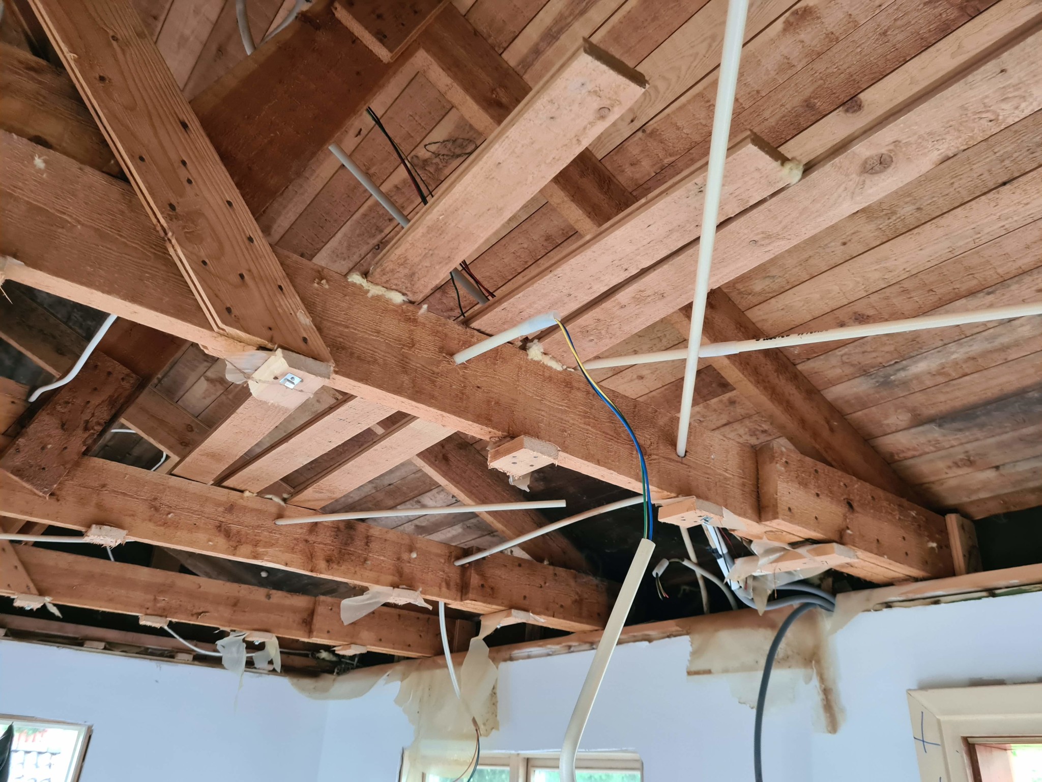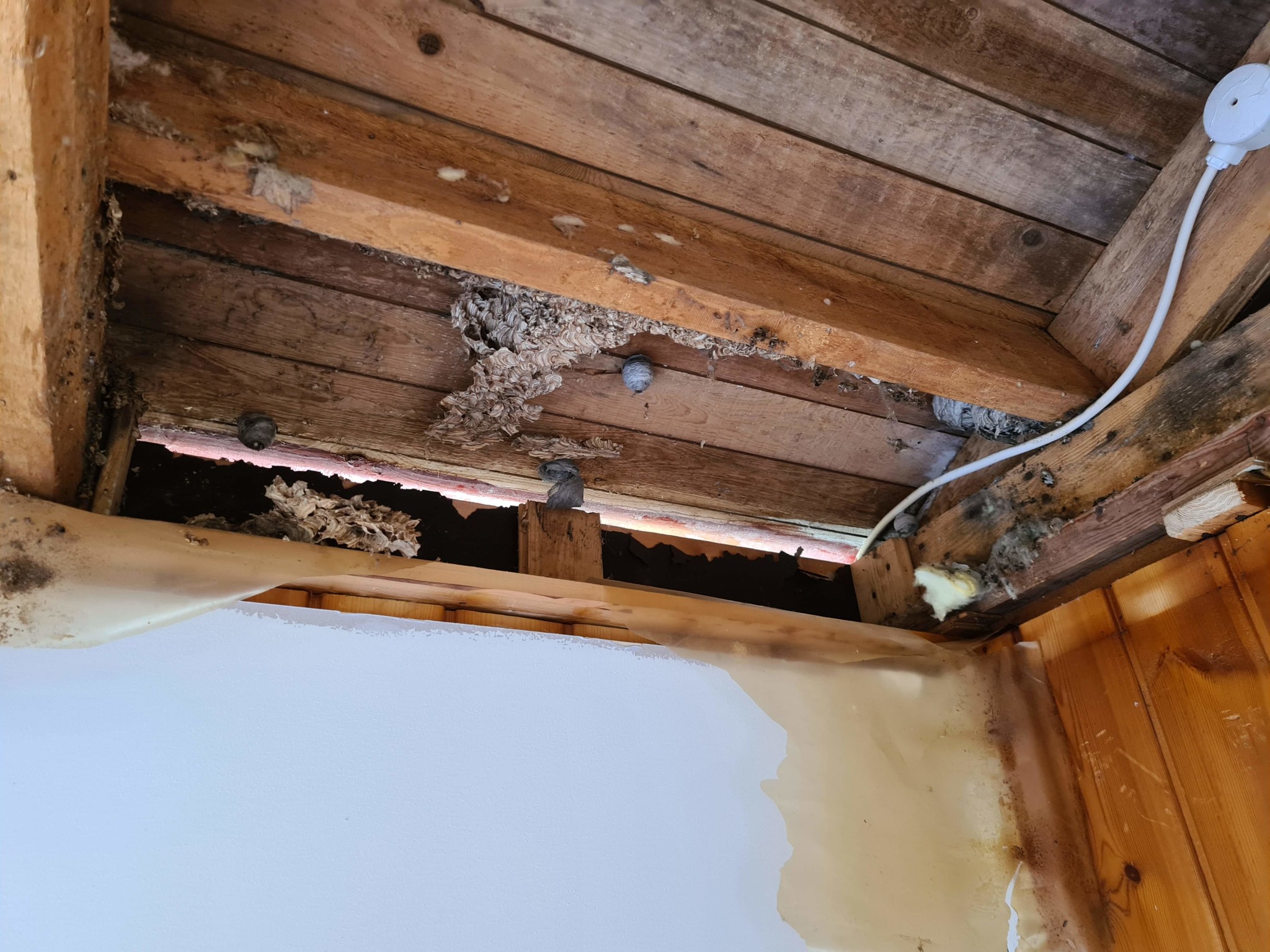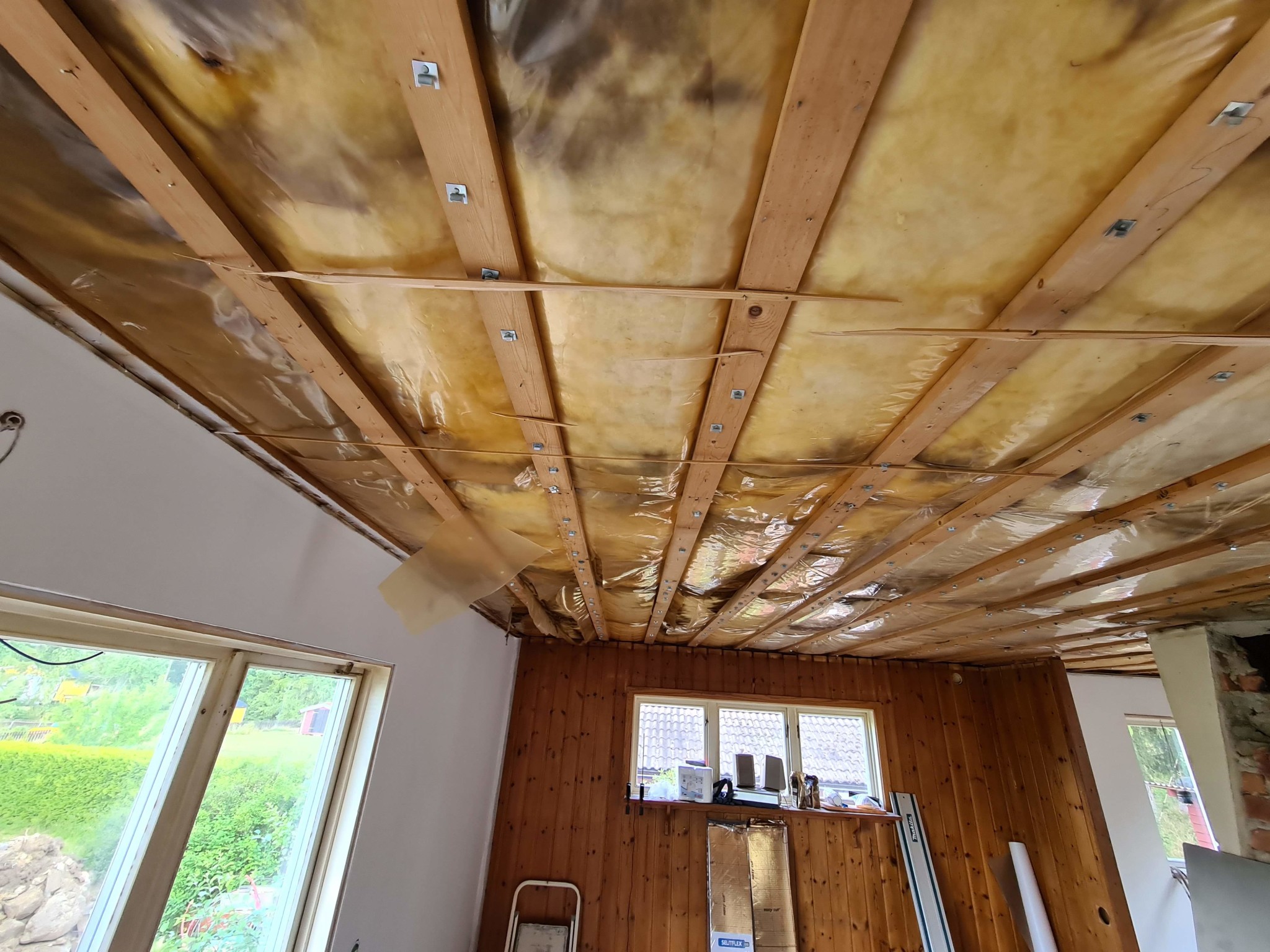 Vi har köpt ett fritidshus från 60 talet, ganska sliten och vi har börjat förnya vissa delar, bland annat tagit bort gammalt takpanel och upptäckt då att isoleringen är i dålig skick. Det finns missfärgningar på olika ställen (svarta) så vi tog bort all isolering och kommer att lägga till en ny.