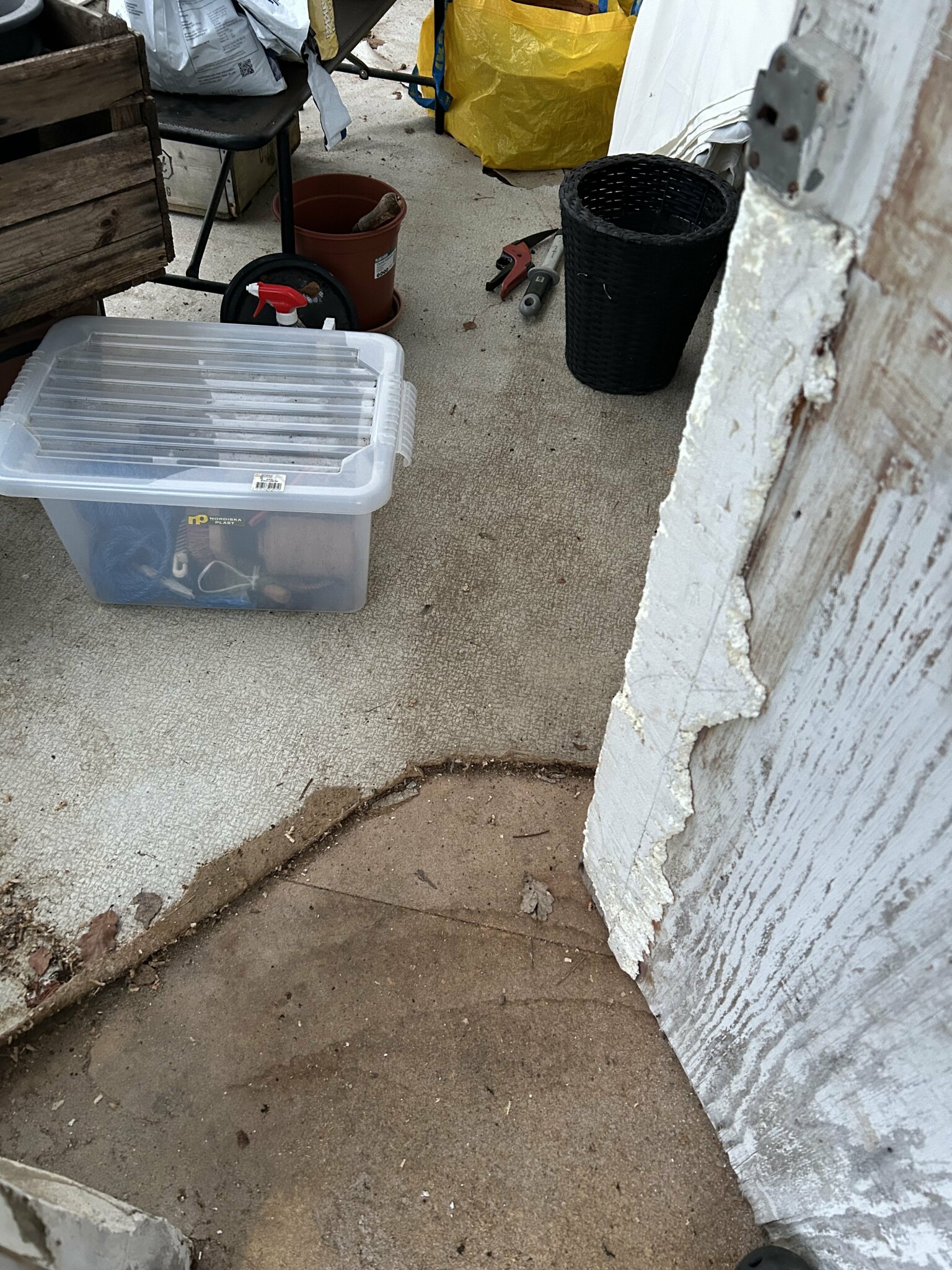 Vi har tagit över ett gammalt växthus, kanske 50-tal. Inte glasat utan stenväggar och en sida med snett plasttak. Huset är 8 kvadratmeter och står stadigt på berg. Golvet är ganska murket, i botten frigolit med spånskiva ovanpå. Vi misstänker att det är halvruttet/mögel. Måste vi ta ur golvet eller kan vi lägga grus ovanpå befintligt golv och odla utan att byta hela golvet?