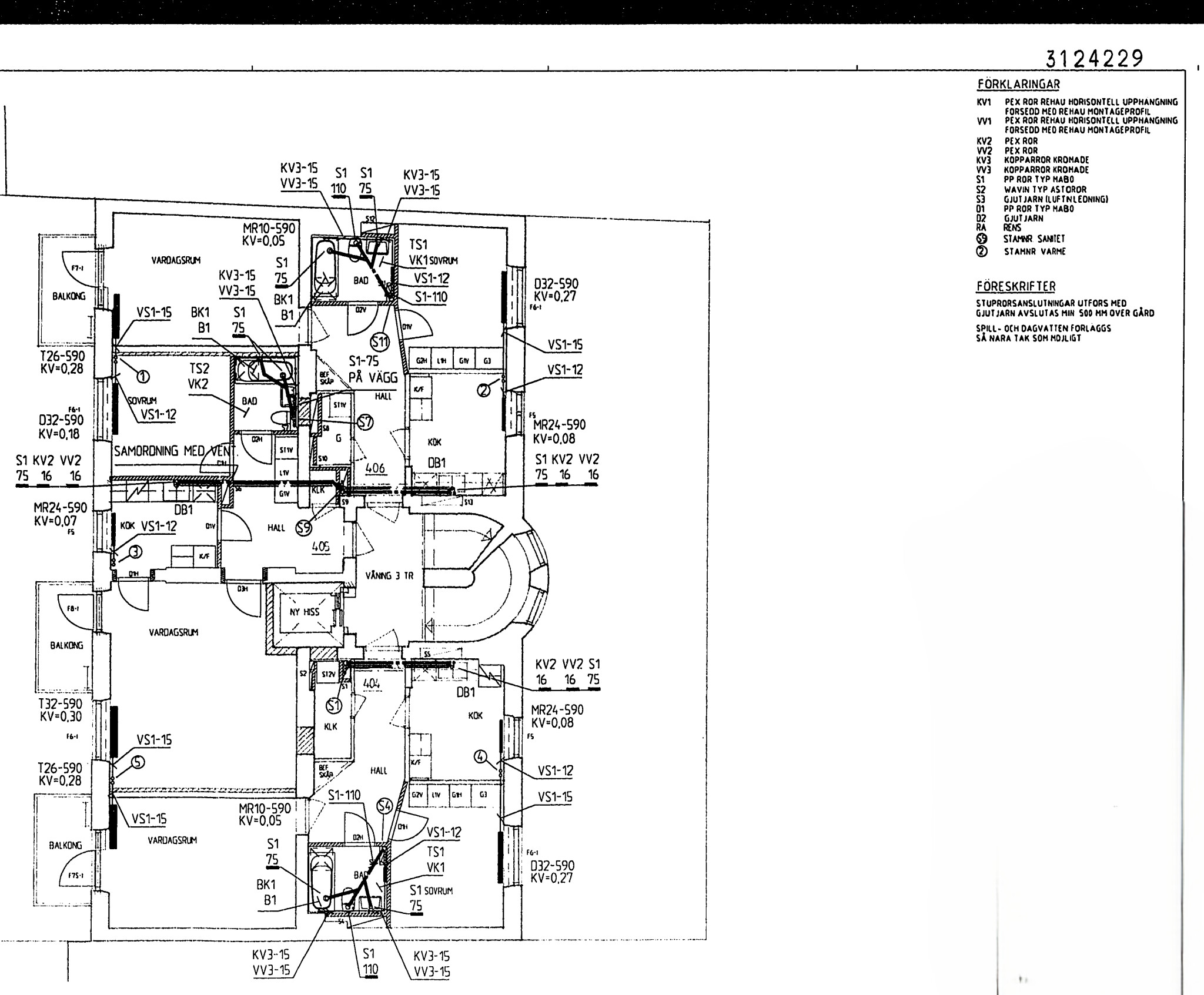 Jag bifogar fyra ritningar varav två där jag markerat min lägenhet med blått. En av ritningarna visar lägenheten ovanför (rött) och den sista visar vatten- och avloppsstammarna.