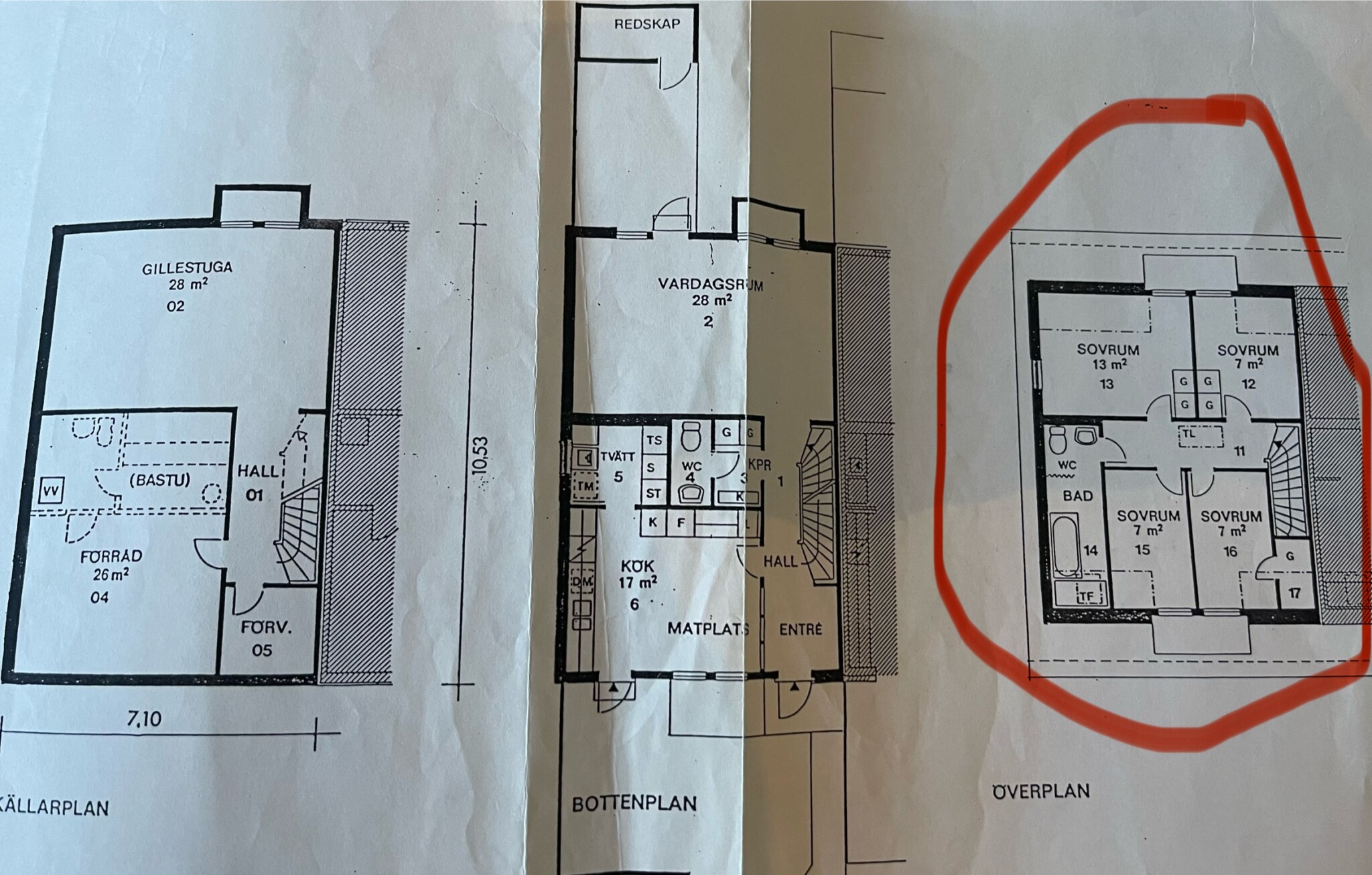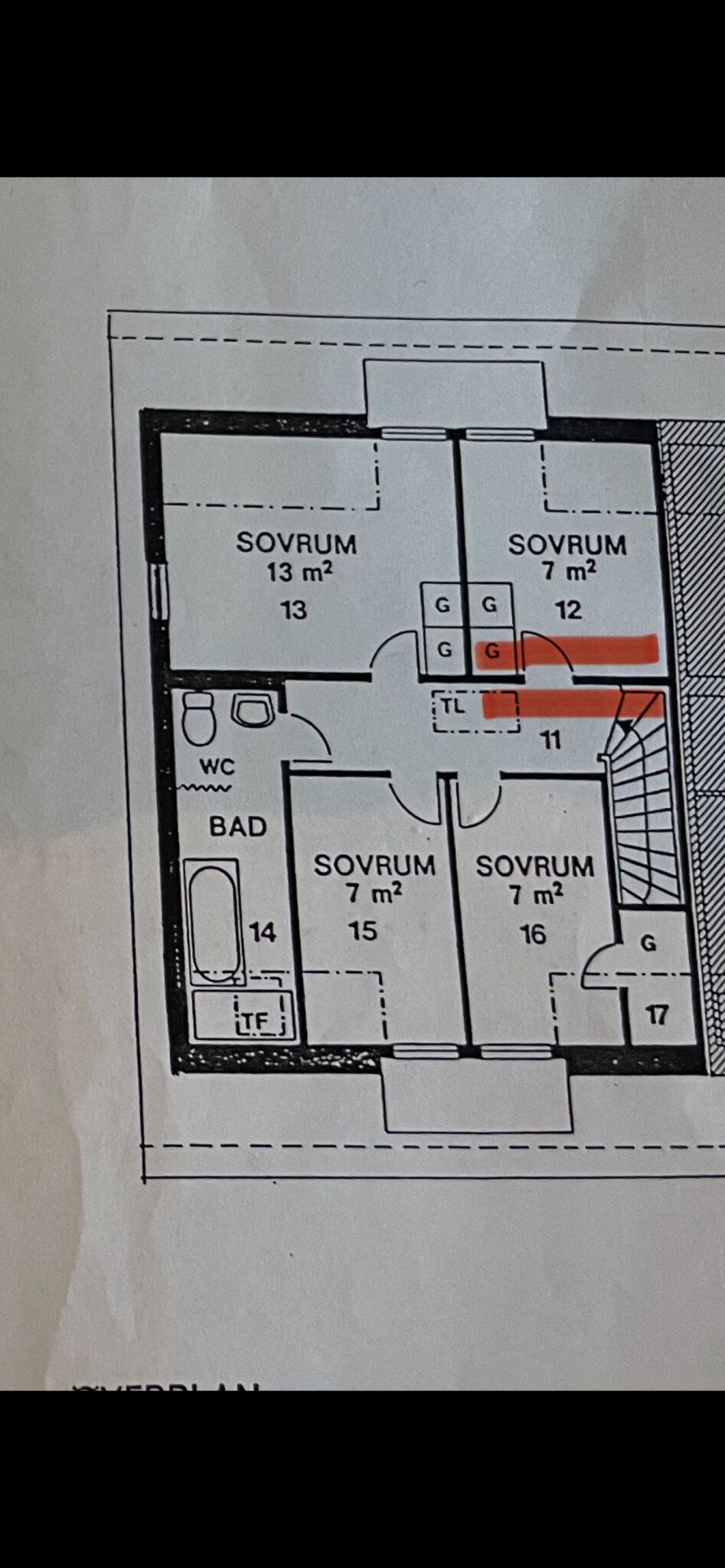 tvåplanshus radhus från 74. Väggen i rött ska bort.