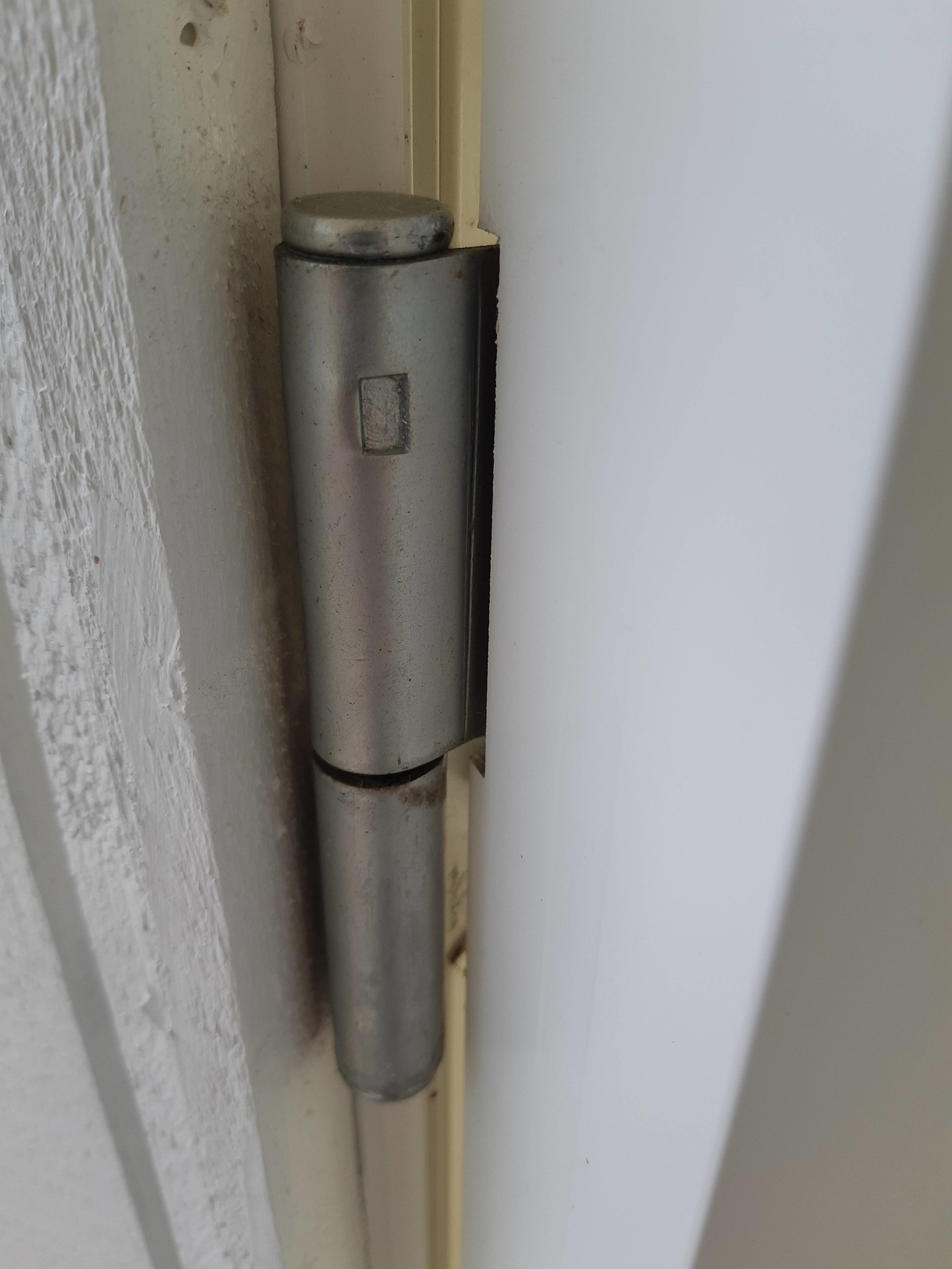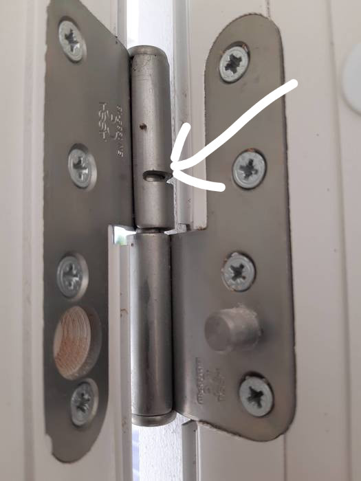 Det är säkerhetsgångjärn och en del går inte att ta isär genom lyft. I det hålet går det inte att sätta något , ev. bricka ska sättas mellan dörr och karmdel i nästa springa nedanför .Vad står det för fabrikat på gångjärnet så kanske det kommer in en låsgubbe och talar om vad som är möjligt