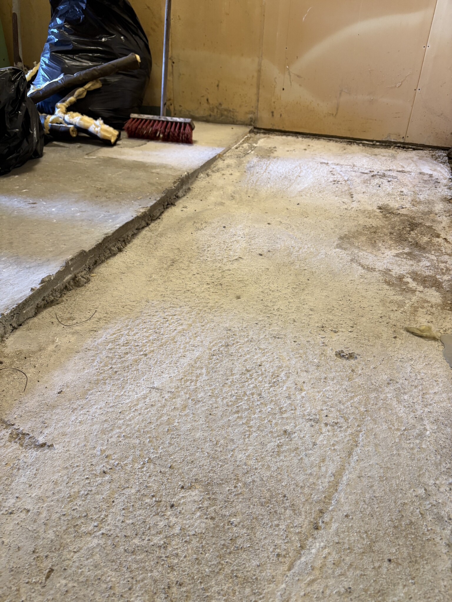 Tog bort oljetanken som stod längst in i garaget. Det var betong under men golvet i resten av garaget är 3-4 cm högre och slätare. Vad fyller man enklast med? Finbetong? Flytspackel? Det kommer inte att stå en bil så långt in.