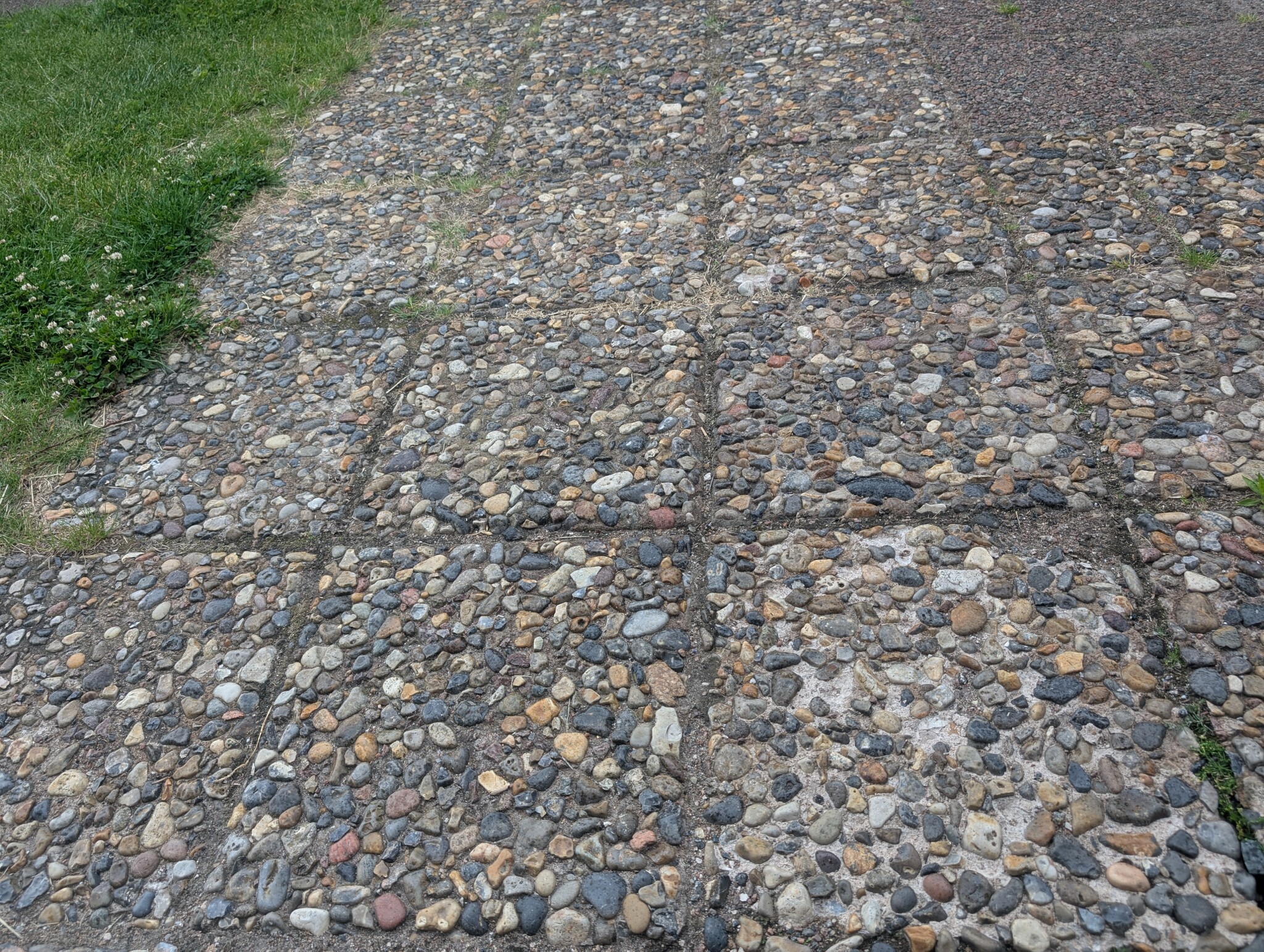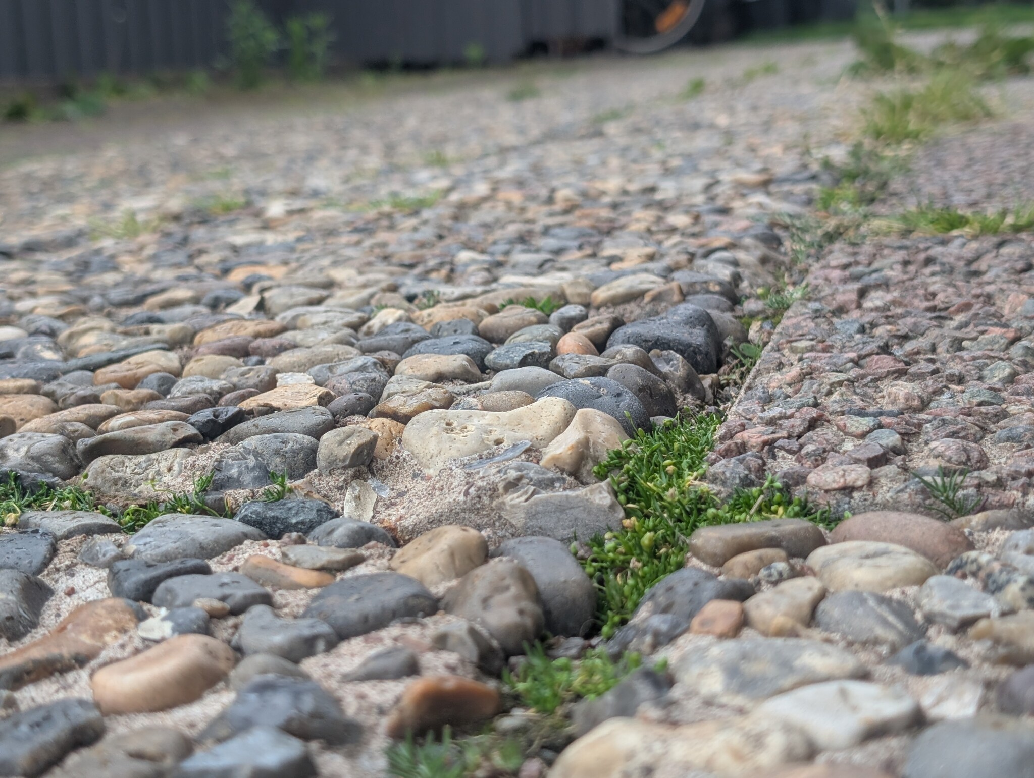 Den lär kunna köra över sjöstensplattorna, lär låta en del när den rullar där. Notera att området kommer att ingå i ytan som klipps.