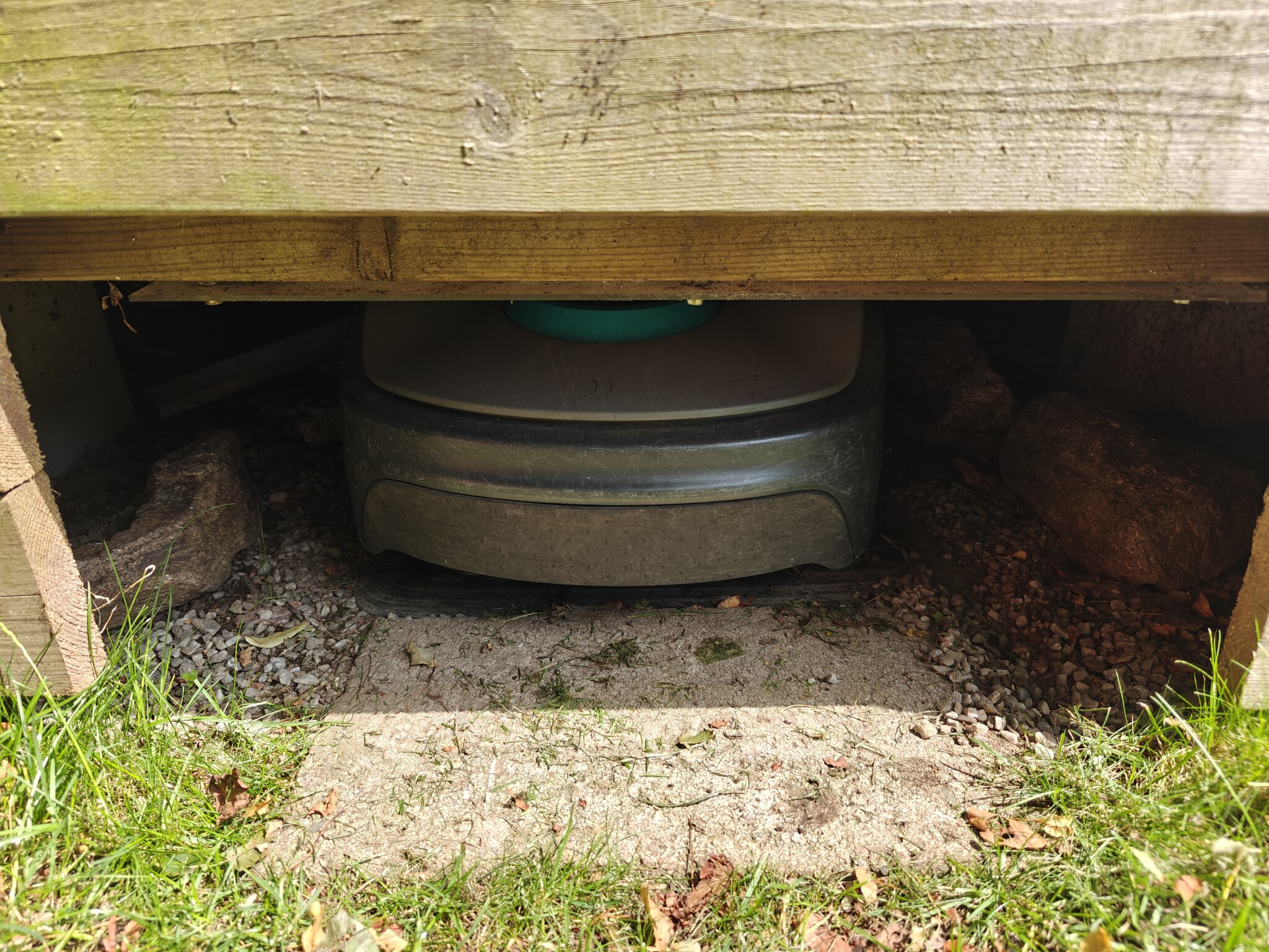 Bah, ingen annan som byggt in sin och har samma problem? Detta hände nu när den skulle docka. Antagligen kom den in snett och skulle rätta till det men misslyckades.F Fideliox skrev:Ytterst sällan så lyckas roboten irra sig in här under mitt trädäck och köra fast. Har ställt in undvik hus men verkar ej hjälpa. Detta är alltså under klippning, inte dockning. Kablar och guide ser ut såhär.