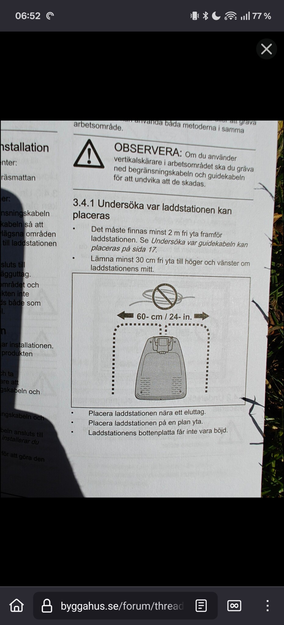 5. När du lägger kabeln så passa på att drar den runt träd och större buskar. Den slipper då onödiga krockar. Tänk kabelriktning ut och hem från "ön" Se bild i manual. Korsa ej kabeln.