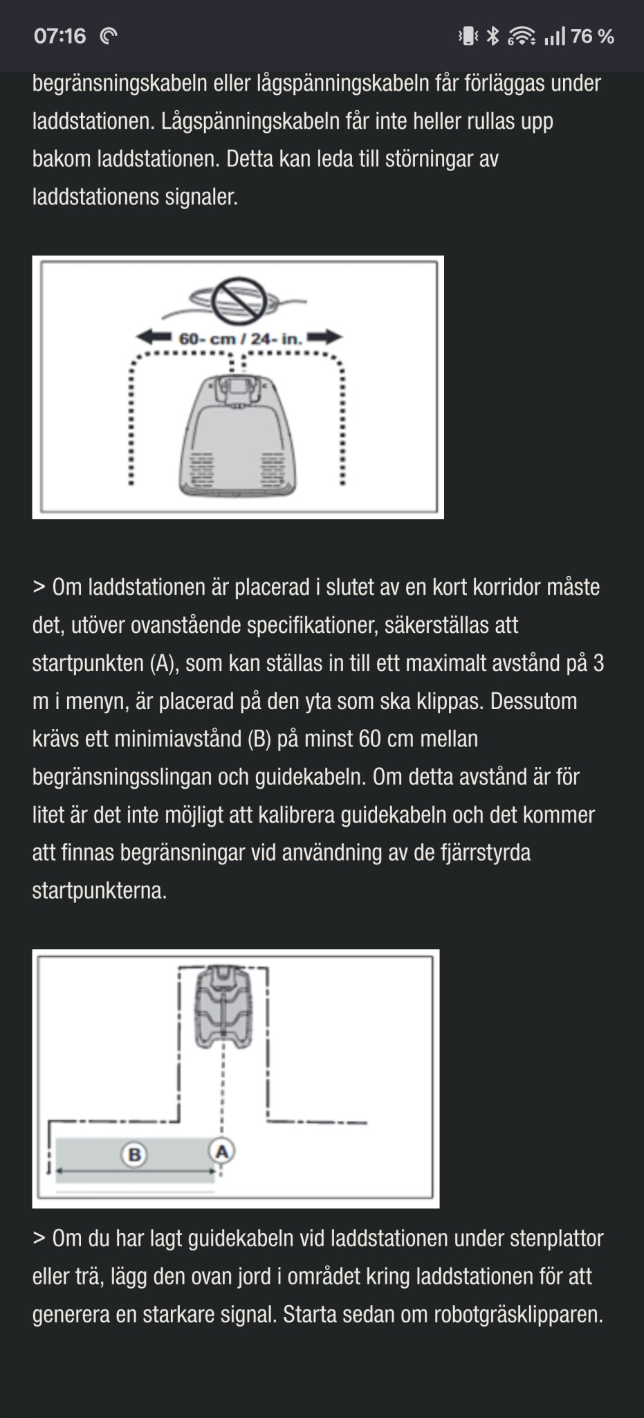 I manualen står det: lämna 30cm på varje sida om guide kabeln. Dvs totalt 60cm mellan vänster och höger kabel begränsningskabel.