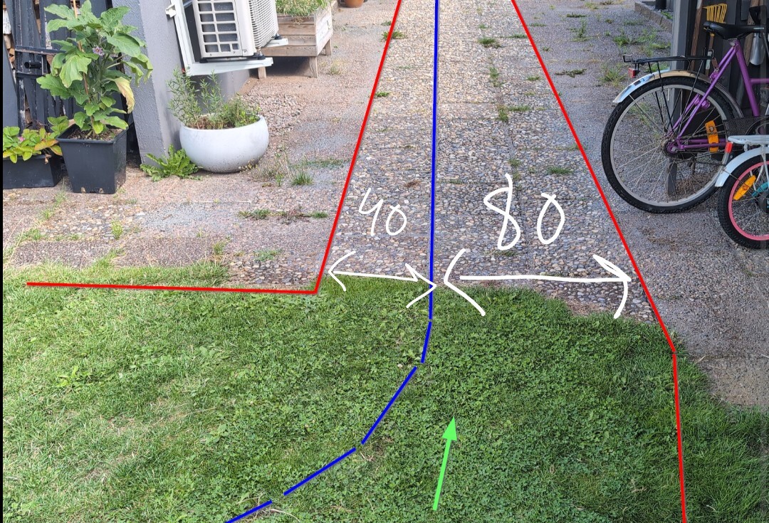 OK, nu kom det en bättre bild. Det ser väldigt tight ut vid staket och rabatt, tror inte du får det att fungera med beg.kablar så pass när just vid staket och rabatt.