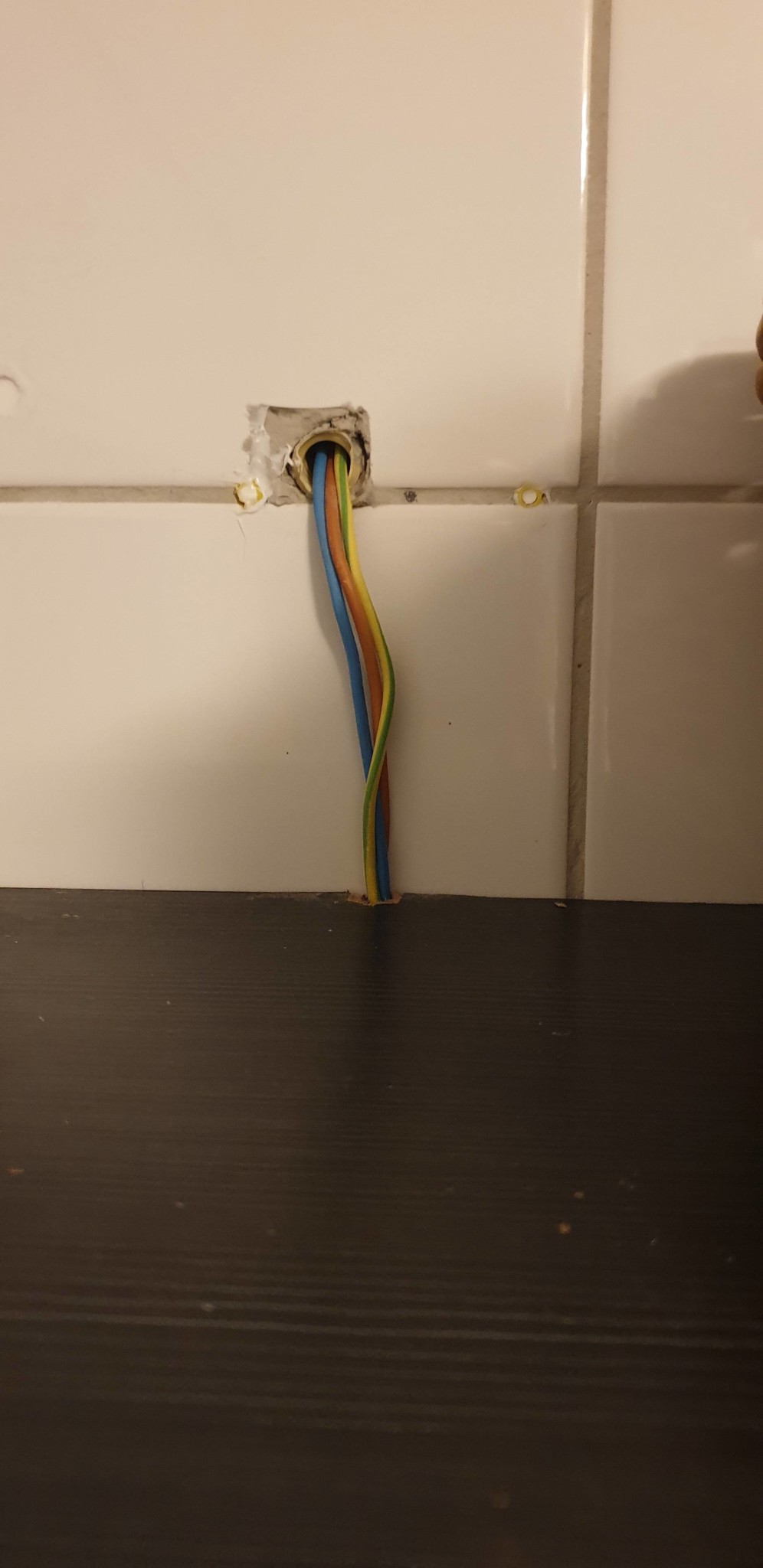 Genomföringen av el är ca 1.9m högt upp och ca 1.6m från duschen. Till att börja med behöver jag säkra tätskiktet då genomföringen är öppen samt om de tre kablarna kanske måste inneslutas i lämplig kabel. Det kosmetiska har prio 2 i detta läge då jag har bråttom inför avflyttningsbesiktningen. Sen kan jag fundera på kabelkanaler eller rent av hitta ett högre badrumsskåp.