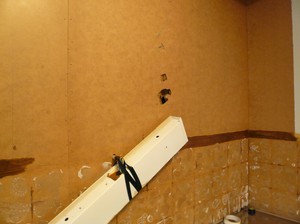 Det gamla köket har åkt till fanders (dvs till garaget) Kvar står vi nu med en vägg i hyffsat fin masonite.