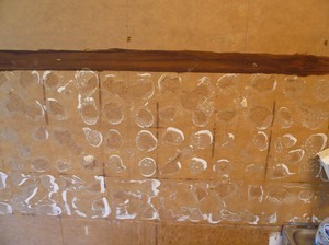 Där det gamla kaklet har suttit är det några håligheter med någon milimeters djup. Det finns också ett helt genomgående hål efter en stadigt möte med kofoten under rivningsmomenet.