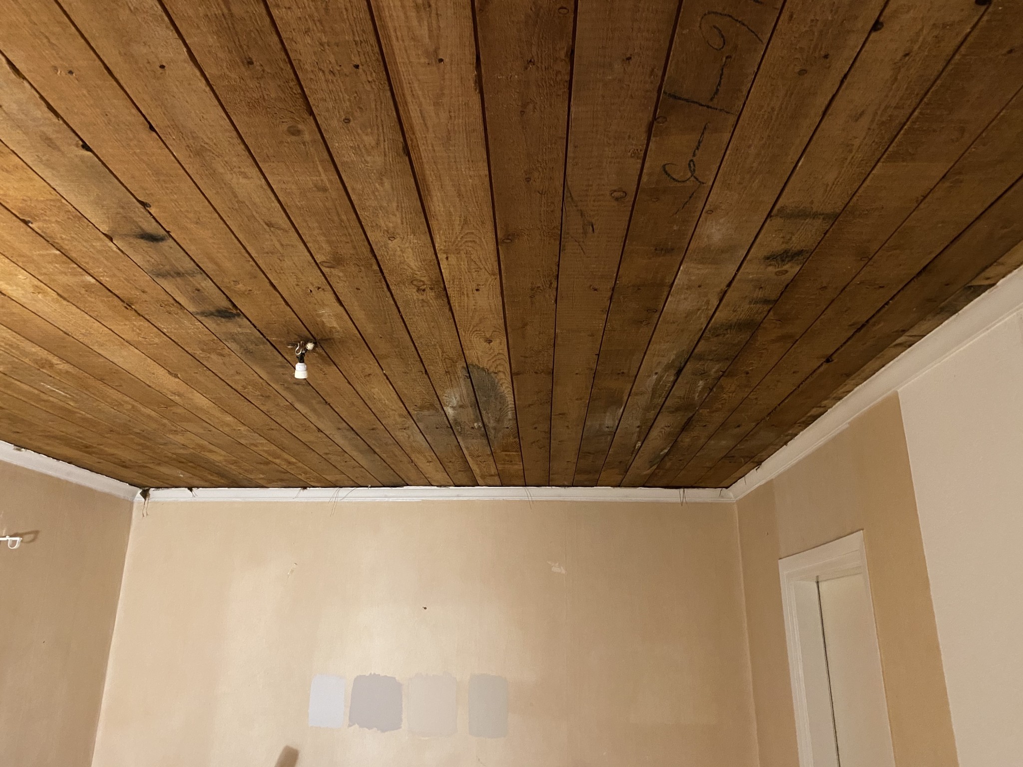 I dags läget sitter det vävspänt tak som är i dåligt skick. Efter en lång övervägning har vi nu bestämt att riva ner innertaket och sätta upp gips.