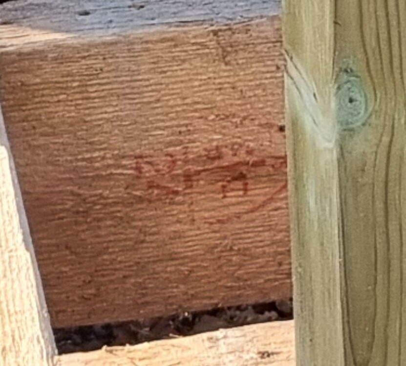 Ser ut att stå "24", så antar att det är c24 klass men resten kan jag inte tyda. Bättre bild går heller inte dessvärre. Virket kan teoretiskt vara från 60-70 tal men mer sannolikt runt millennieskiftet. Tryckimpregnerat?