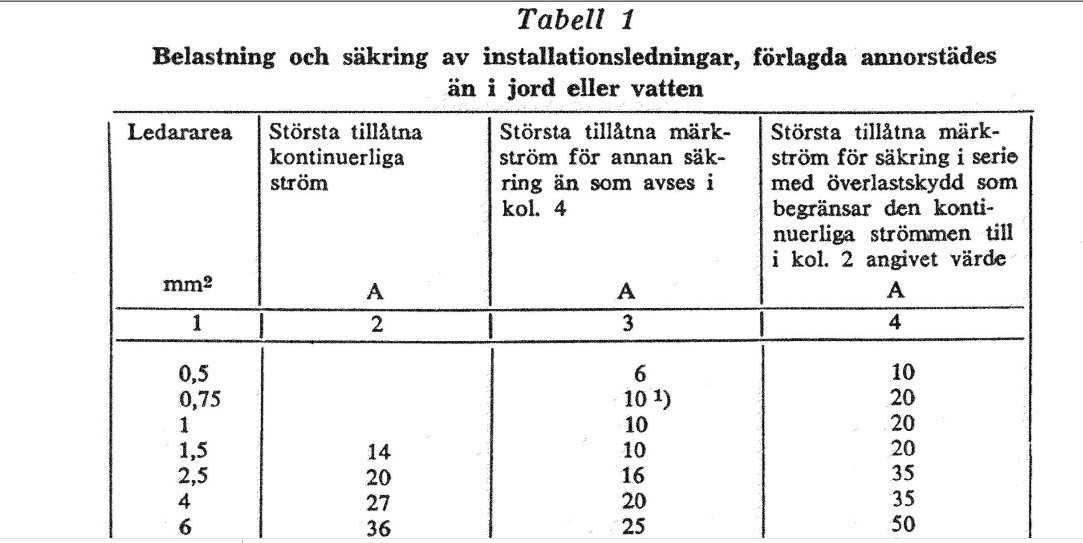 Ja en gång i tiden, när man antog att ingen annan än en fullfjädrad elektroingenjör skulle kunna räkna lite multiplikationer och divisioner och förstå sambanden, så fanns det tabellerade strömvärden i föreskrifterna. Dessa gick väl egentligen inte heller att använda alltid, ty de tog ju ingen hänsyn till ledningslängd och förimpedans och därför inte heller spänningsfall och tid för automatisk frånkoppling vid jordslutning.Ulltand skrev: