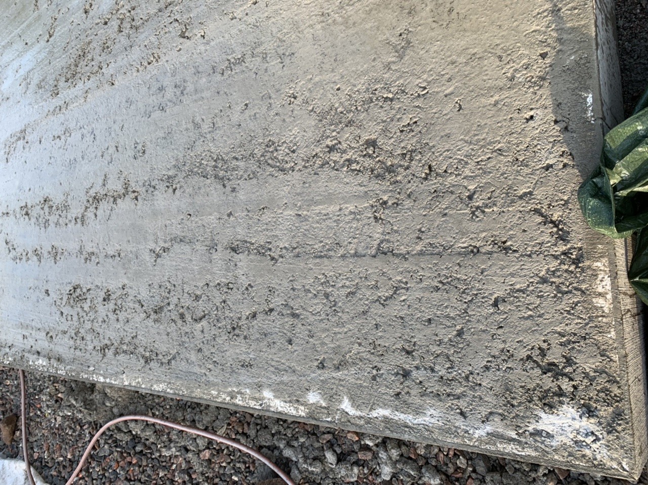 Hela formen vibbrades med en eldriven vibbrastav och drogs av med en lång rätskiva då det låg för mycket betong. Tror det var det sista momentet som gjorde att den nu ser gropig ut och inte slät och fin.