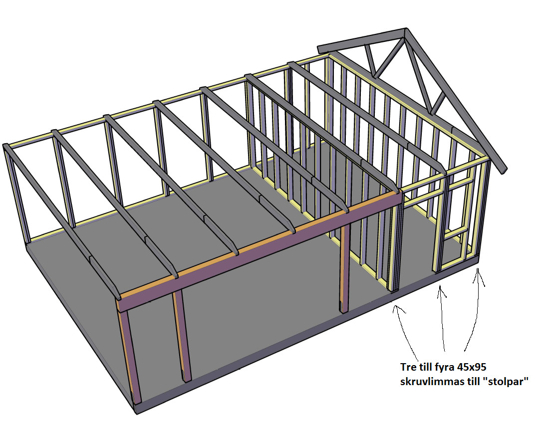 Tar till mig vad gäller väggtjockleken. Tanken var att skruvlimma tre st 45x95 där takstolarna står och på så sätt få ett stabilt bygge. Förutom där takstolarna vilar så ska ju inte väggen bära så mycket mer än sig själv (tänker jag iallafall). Plywood skruvat på insidan skulle ge stabilitet i sidled. Takstolarna är dimensionerade för tungt yttertak, lätt innertak och snözon 2,5 vilket ger 0,9+0,25+2,5=3,65 kN/m2. Med ett tak på ca 67m2 blir det totalt ca 245 kN, ~24,5ton för hela taket. Grovt räknat ger takstolarna upphov till 16 punkter/stolpar som lasten ska fördelas på, dvs ~15,3 kN/stolpe (förutom de som håller upp limträbalken, de får dra ett tyngre lass, men för "stolparna" i förrådsdelen borde det stämma hyggligt?)